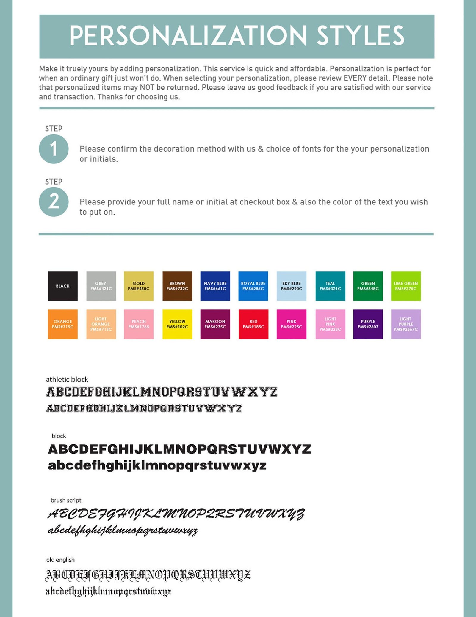 Please remember to specify the color of text and font style when you place the order. And please let us know if you want same color of font as listing image.