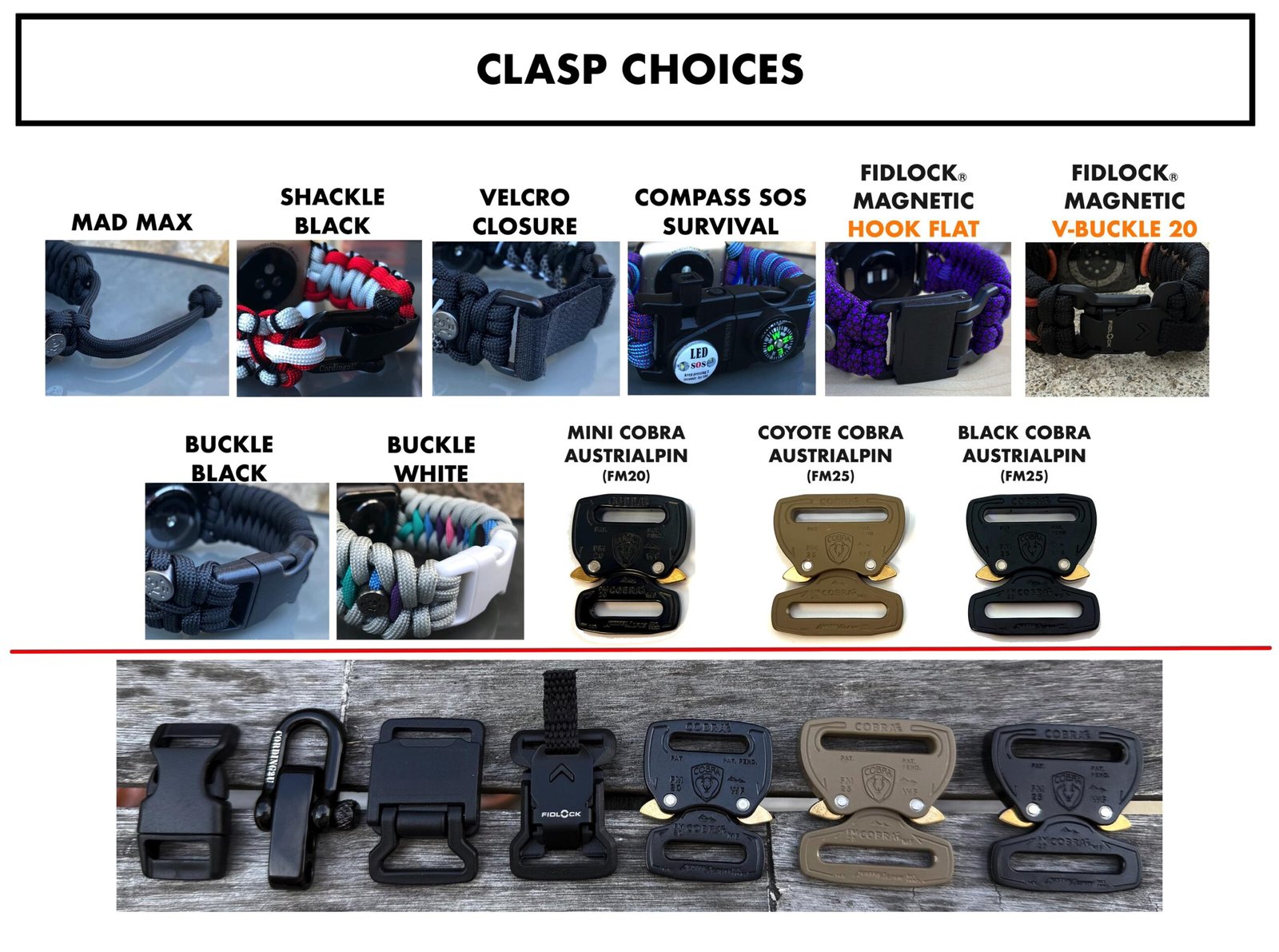 Buckle Black ,Buckle White ,Mad Max ,Shackle Black ,Velcro Closure ,Compass SOS Survival ,Hook Flat Magnetic ,V-Buckle 20 Magnetic ,MiniCobraAustriAlpin ,Coyote Cobra FM25 ,Black Cobra FM25 |