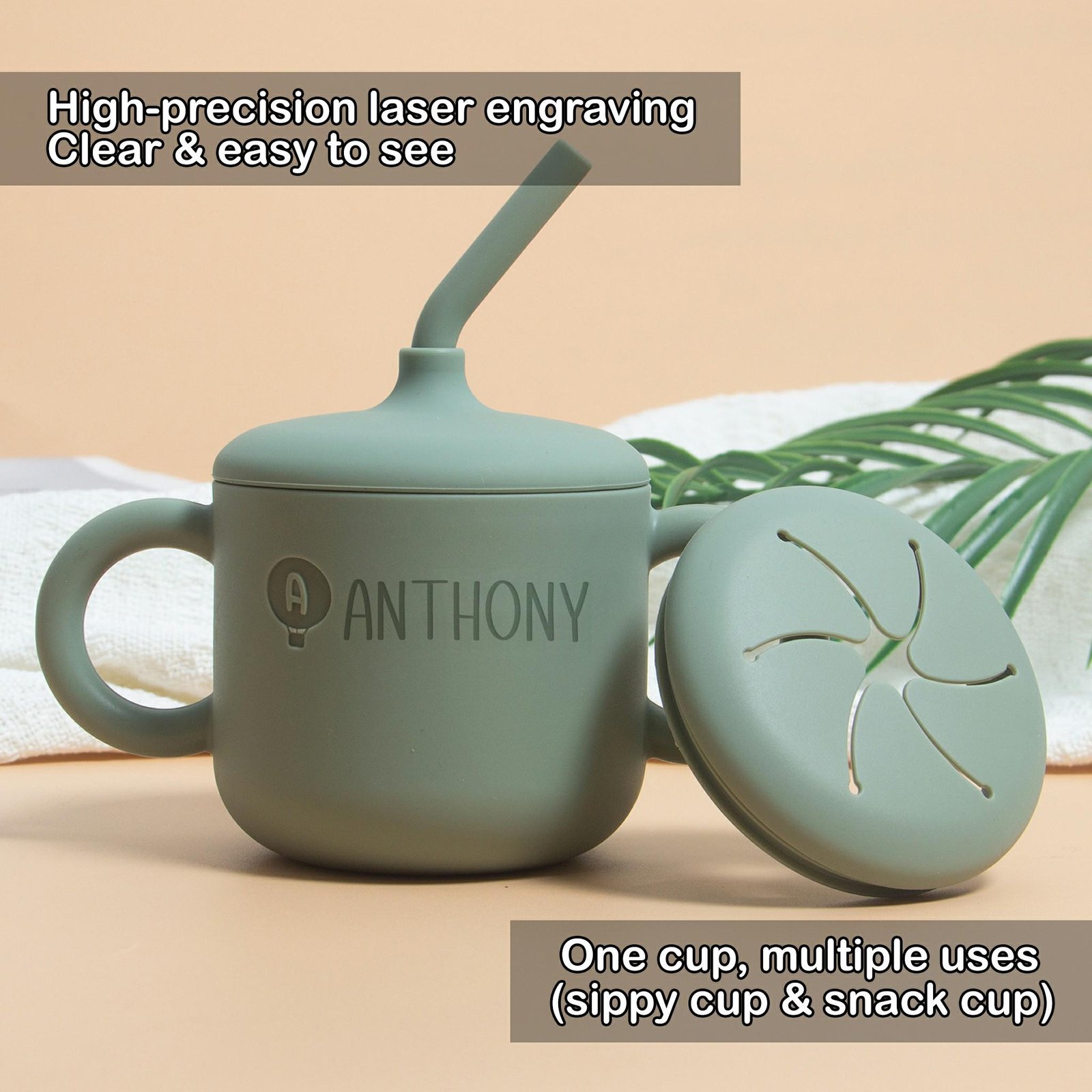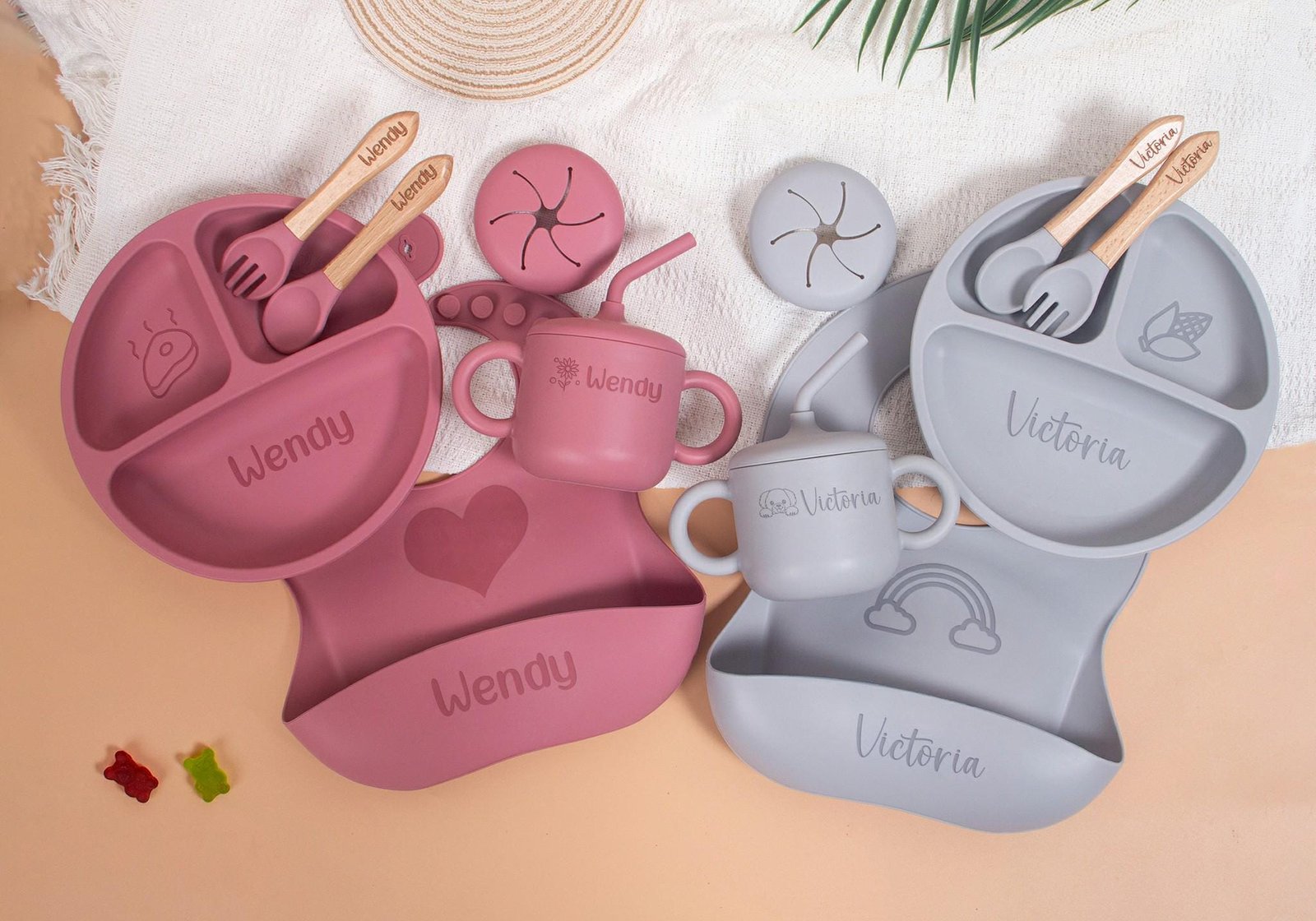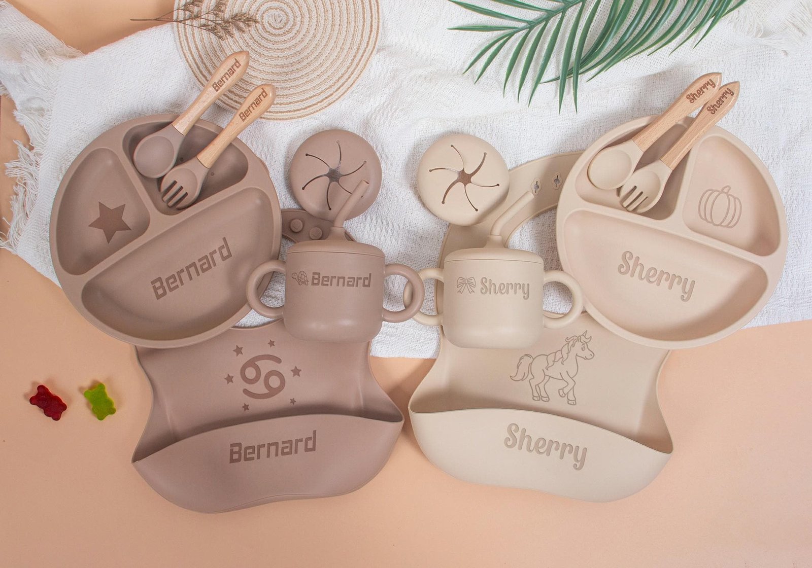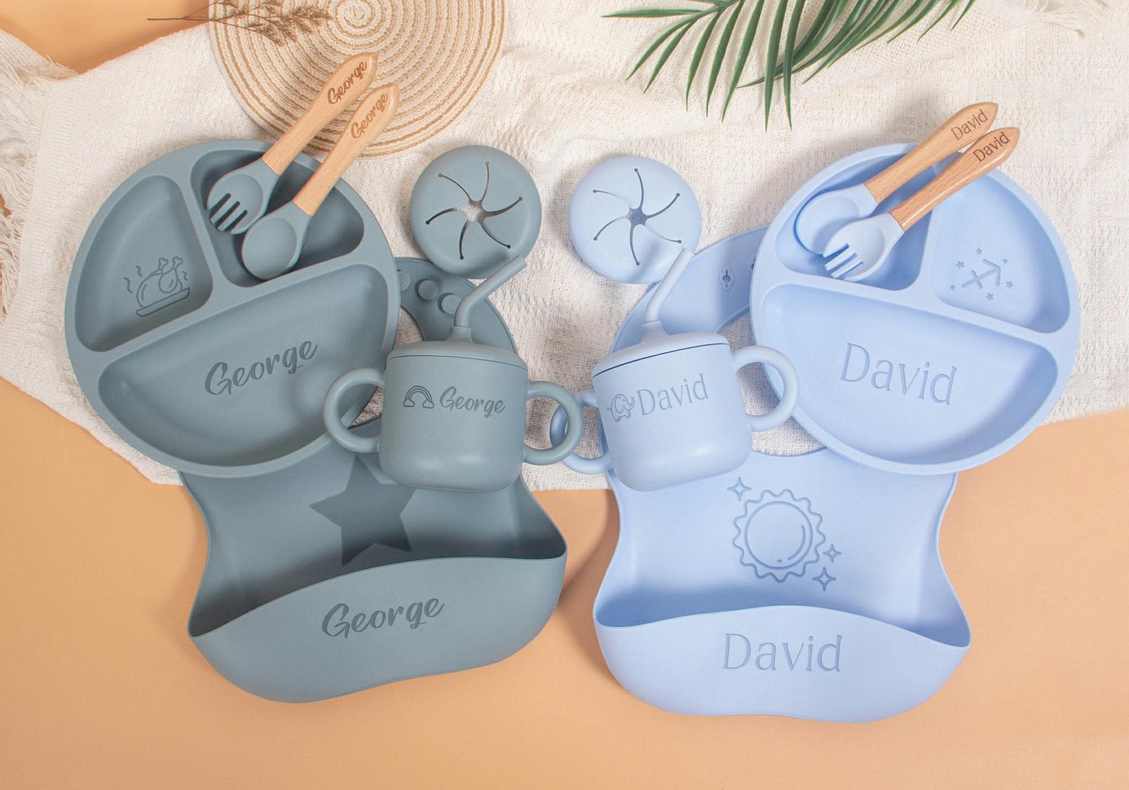 Personalized Silicone Baby Feeding Set: 6-in-1 Engraved Plate, Bib, Utensils, Sippy Cup & Snack Lid