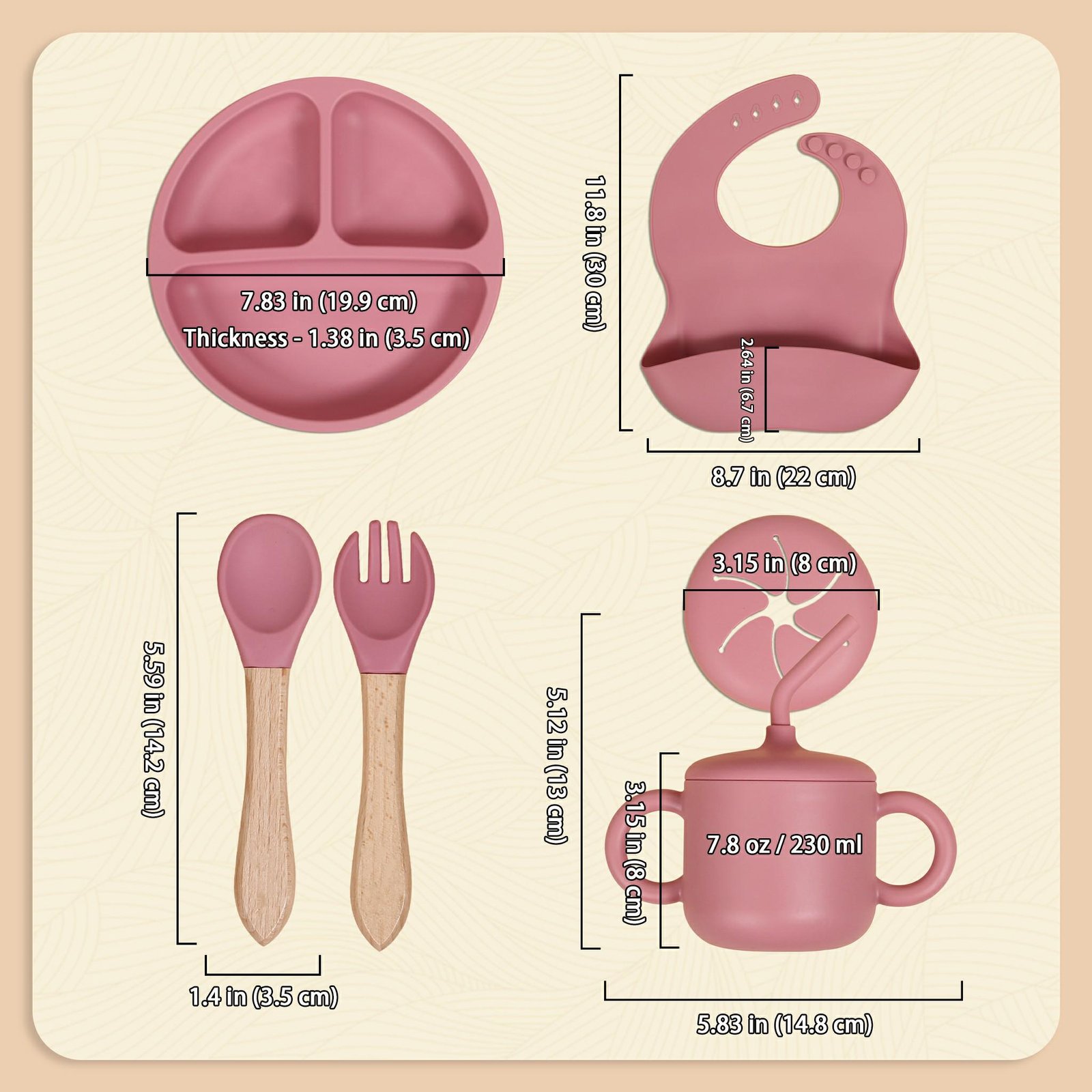 ✓ 6-in-1 set: Includes 1 plate, 1 bib, 1 fork, 1 spoon, 1 sippy cup with a straw 7.8 fl oz / 230 ml, and 1 snack cup lid
