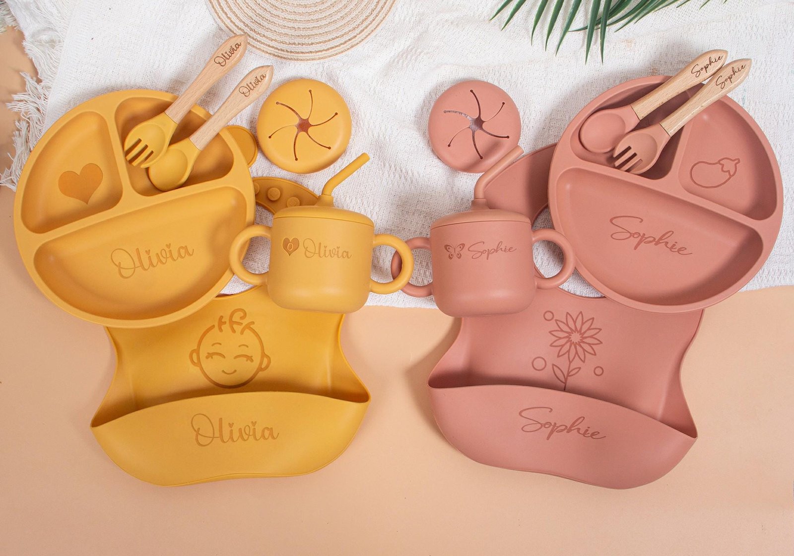 Personalized Silicone Baby Feeding Set: 6-in-1 Engraved Plate, Bib, Utensils, Sippy Cup & Snack Lid