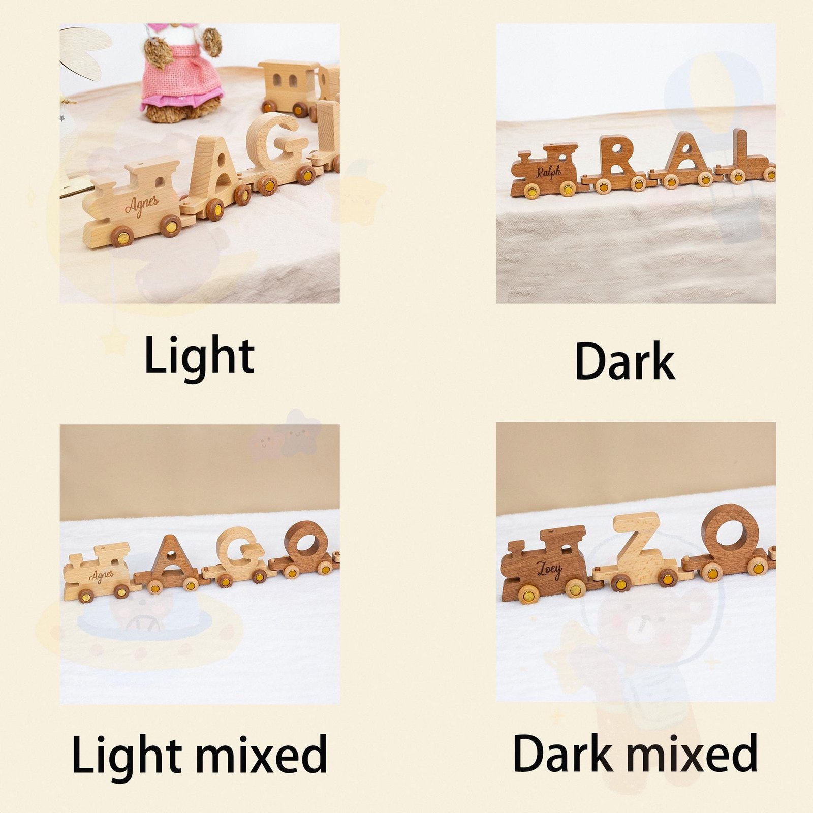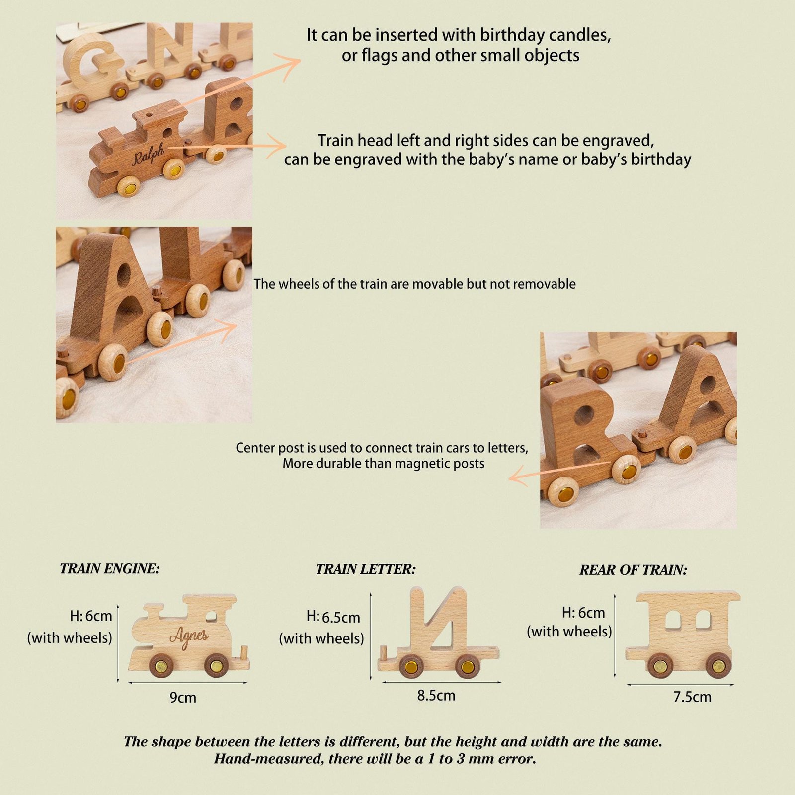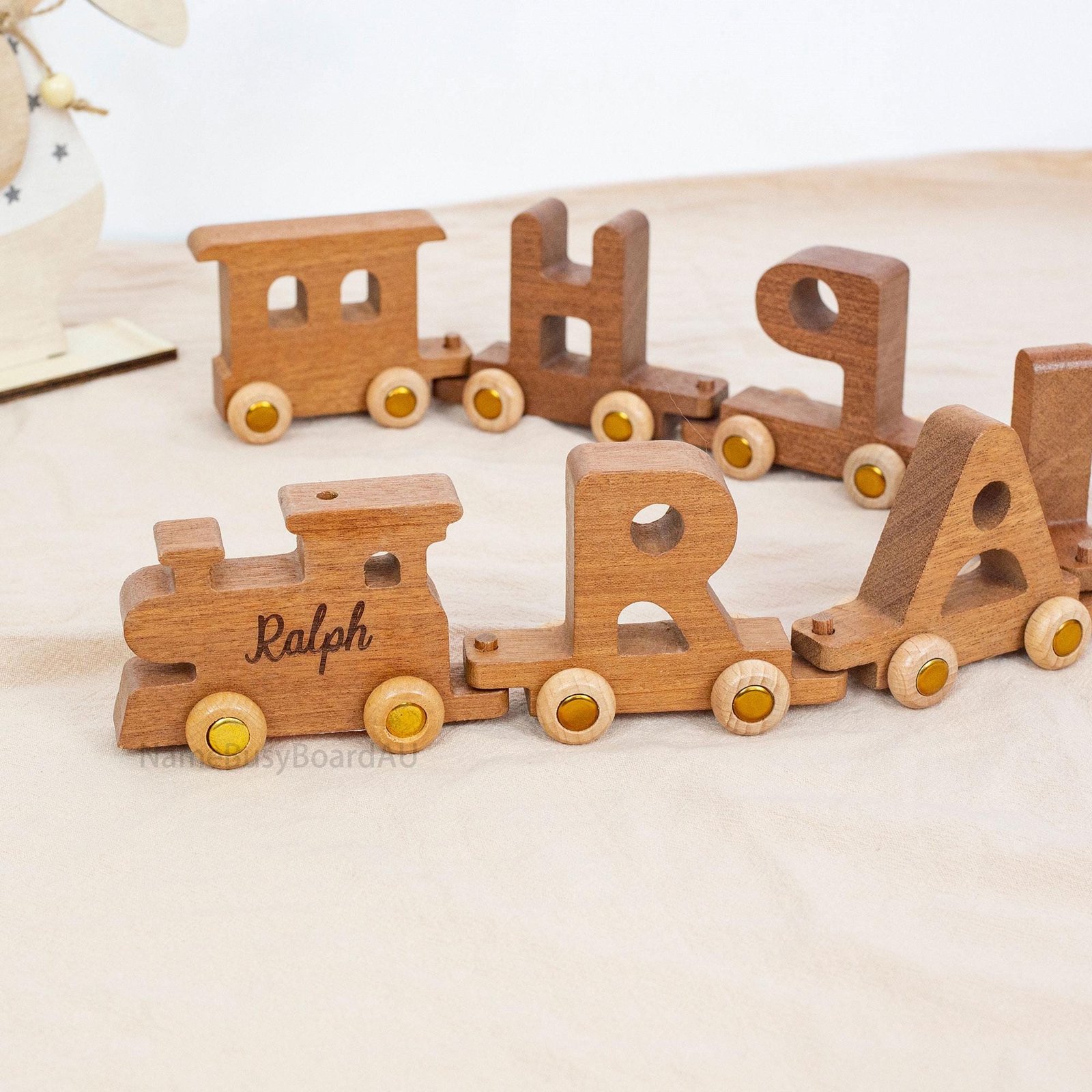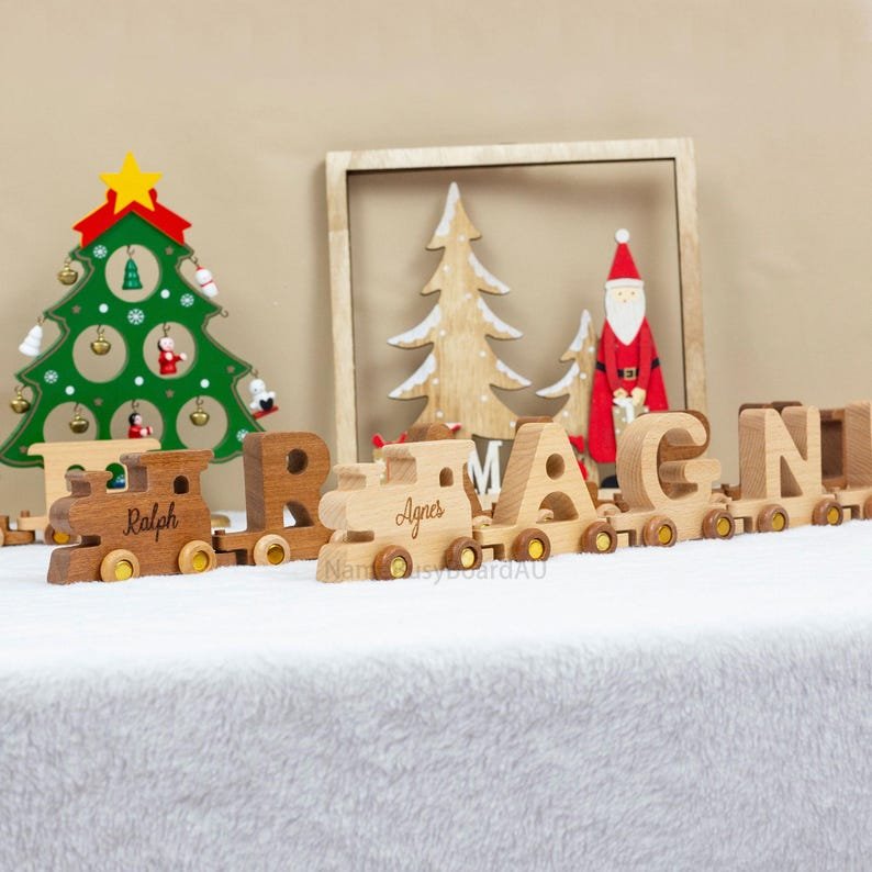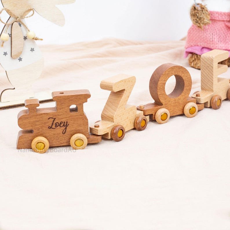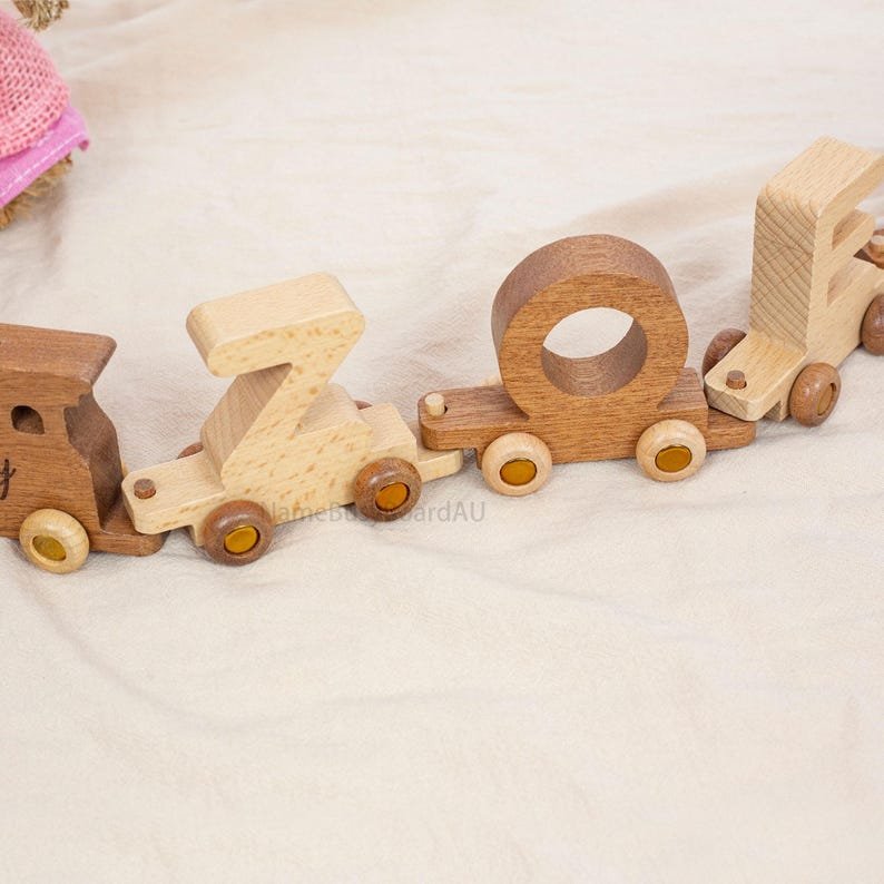 🌲Our wooden letter trains are hand-cut from solid wood. The train cars are made up of letters. The front of the train can also be engraved with a child’s name or a phrase for the child.