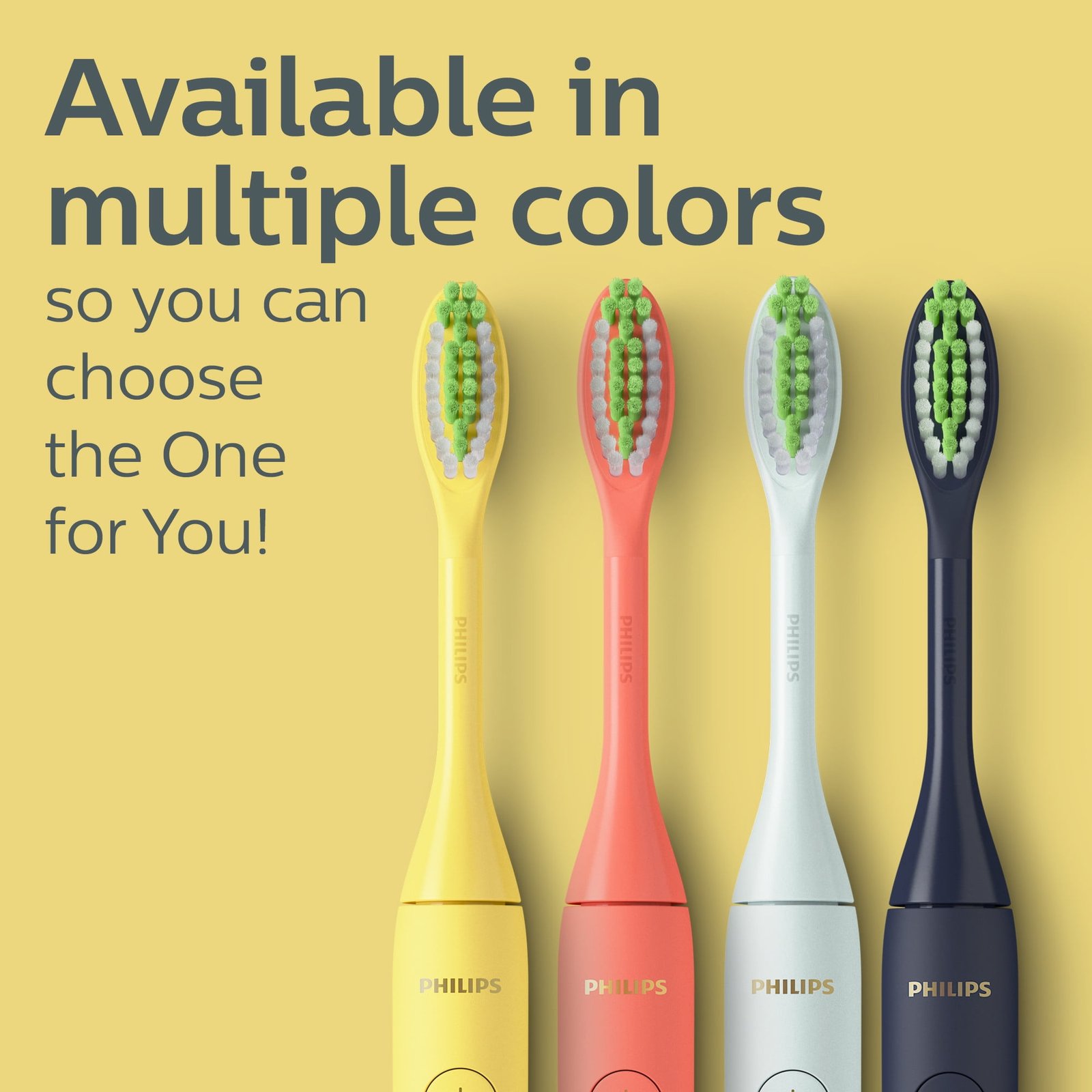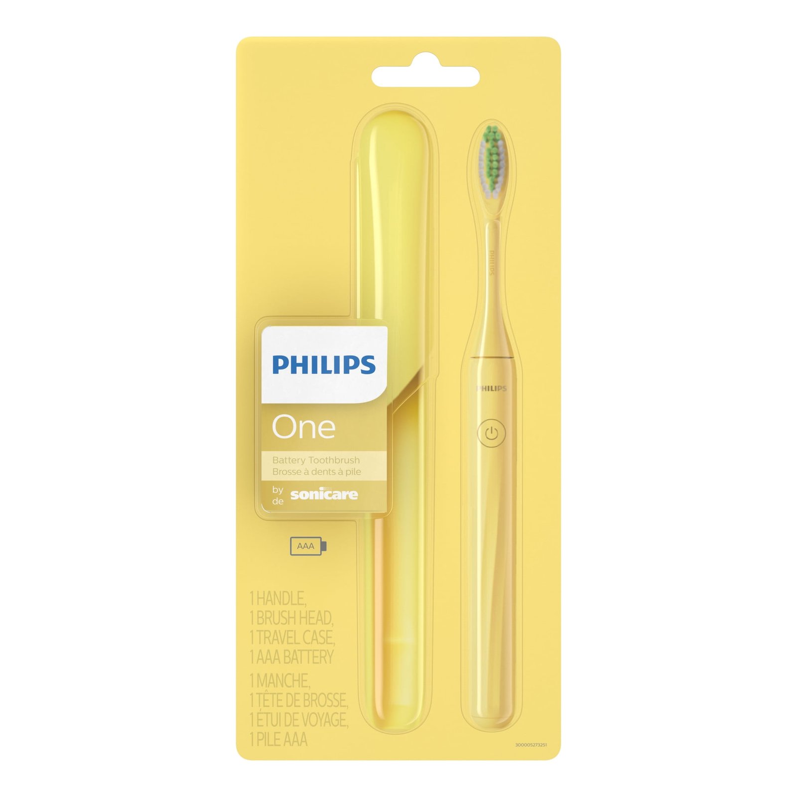 Philips One by Sonicare is an ultra-portable electric toothbrush that keeps your smile bright. Always be ready to touch up your smile, no matter where the day takes you. One 1 Philips One by Sonicare Battery Toothbrush and matching brush head; 1 travel case; 1 AAA battery