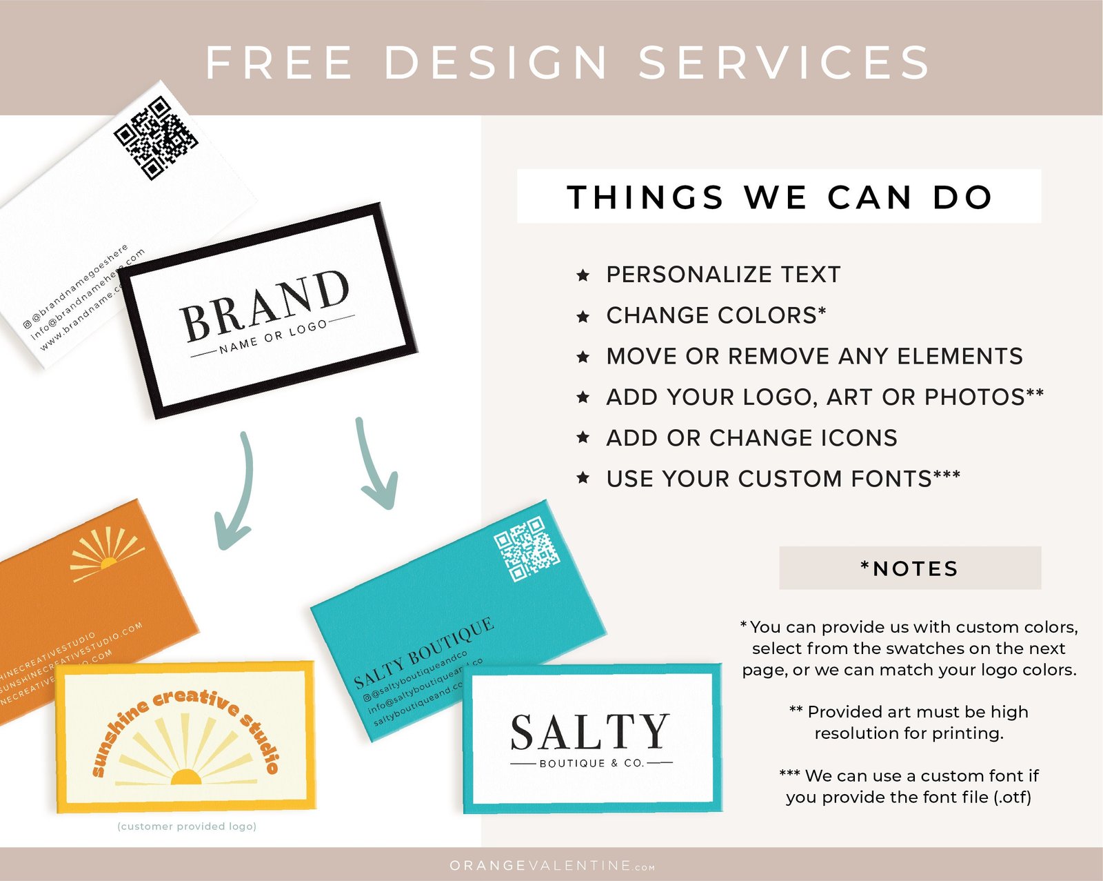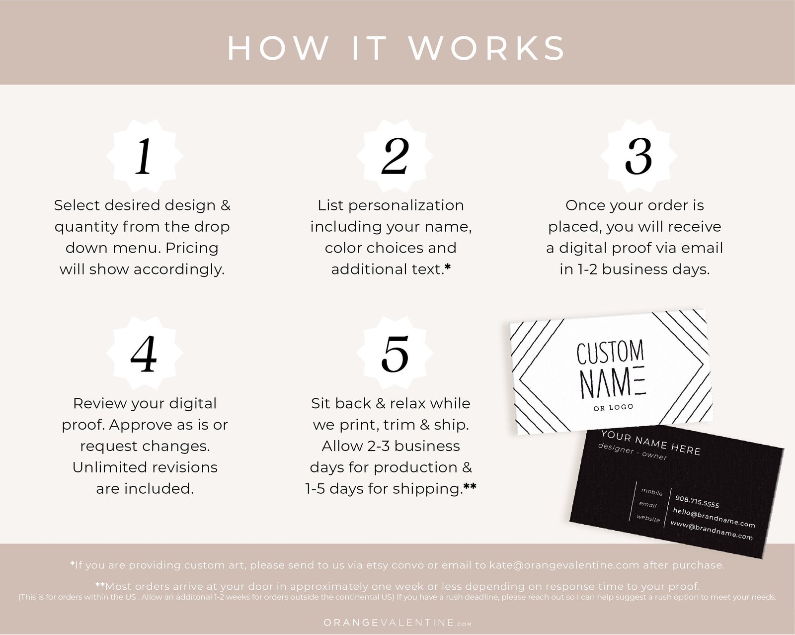 We design and print business cards on premium matte card stock. You provide us with your custom details and logo if you have one and we customize the design, send it to you for approval, then print and ship. All with quick turnarounds, personal graphic design service, and premium paper & printing.