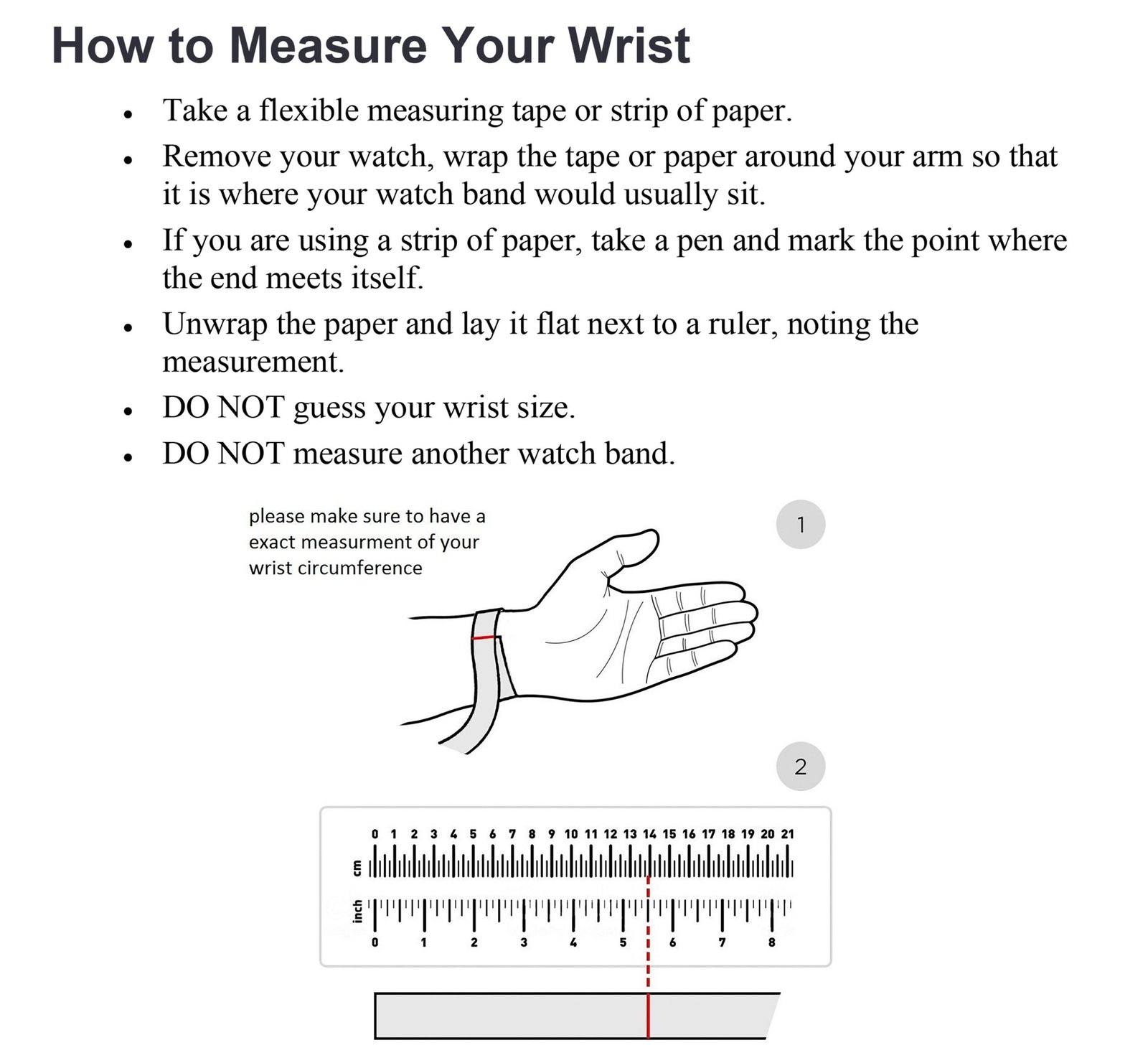 •Be sure to measure where you wear your watch, you want the tape measure snug but not too tight.