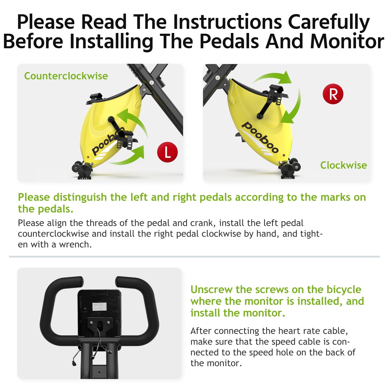 - 【Easy Get On/Off Frame & Foldable Design] pooboo exercise bike designed with lower cross design which make it is easy to get on and off. You can move this exercise bike easily with transportation wheels, easy to fold and storage.