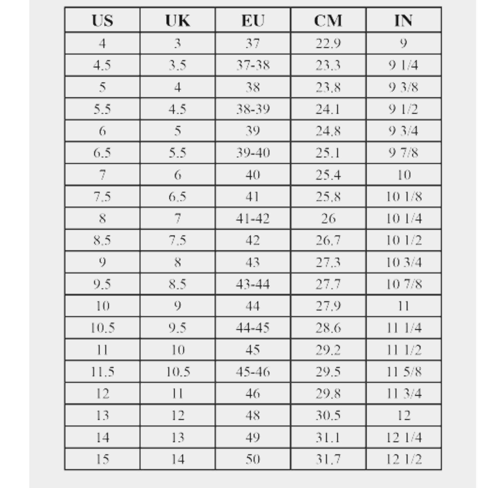 5 US men's ,5.5 US men's ,6 US men's ,6.5 US men's ,7 US men's ,7.5 US men's ,8 US men's ,8.5 US men's ,9 US men's ,9.5 US men's ,10 US men's ,10.5 US men's ,11 US men's ,11.5 US men's ,12 US men's ,12.5 US men's ,13 US men's ,13.5 US men's ,14 US men's ,14.5 US men's ,15 US men's ,15.5 US men's ,16 US men's |