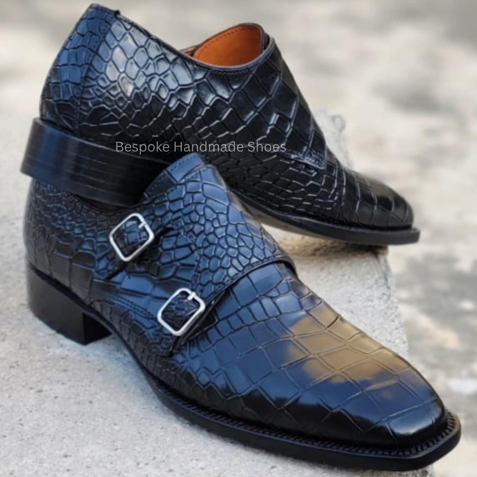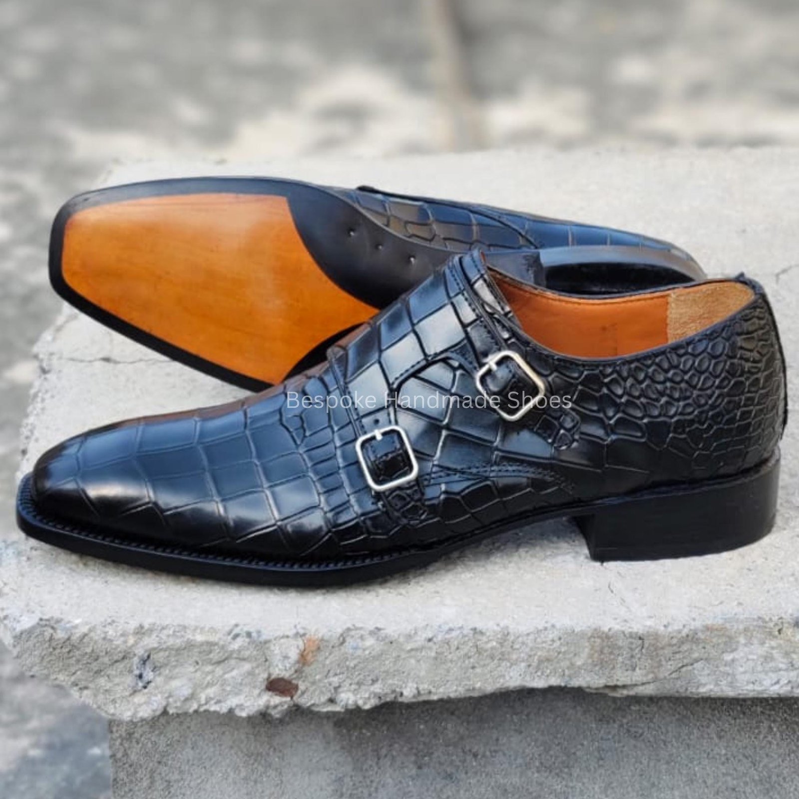 Pure Handmade Men's Genuine Black Croc Print Leather Double Monk Strap Dress Formal Shoes