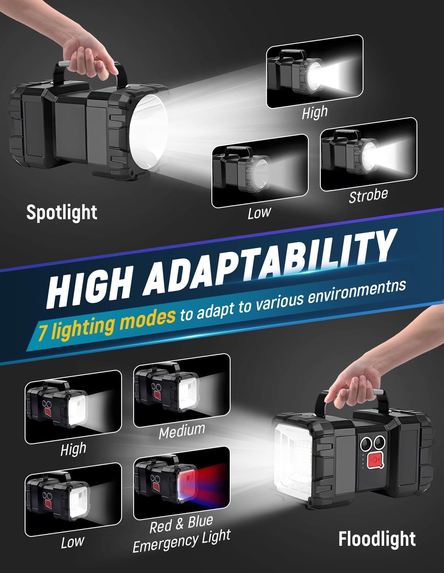It has High -Low- Strobe Spotlights / Low-Medium-Strong Floodlight and Red/Blue SOS light. The side button switch on the led flashlight provides a simple one-handed operation to cycle through the modes. - Durable & Waterproof Flashlight