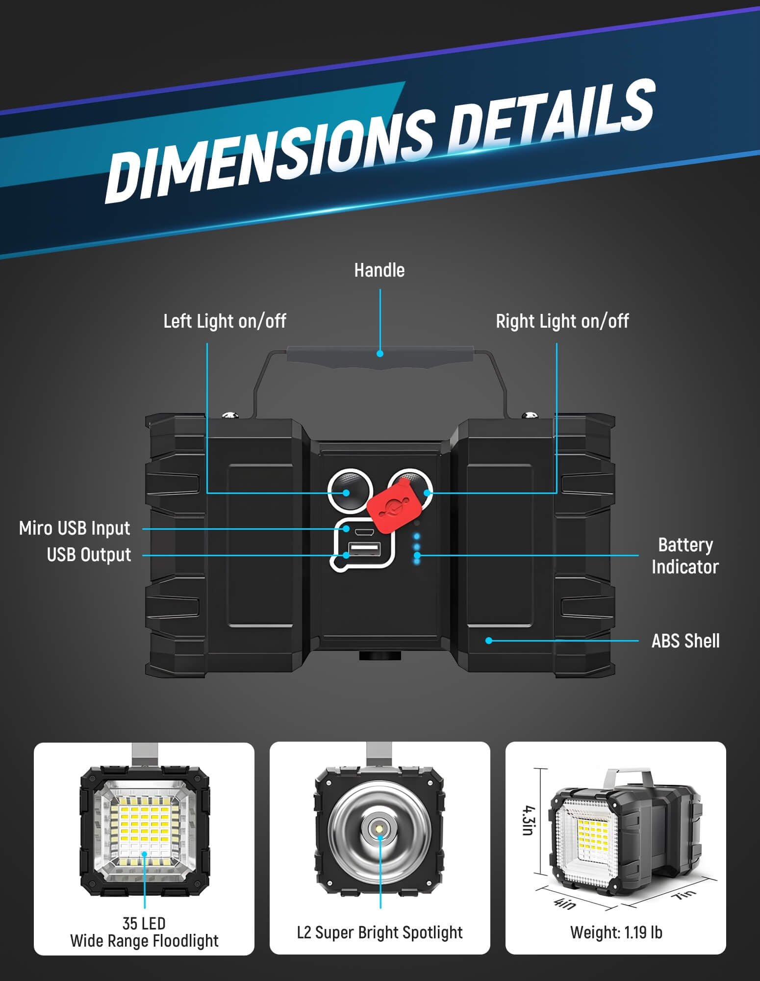 LED flashlight can be light up in both sides at the same time, left side is a strong L2 bulb, the brightness is up to 5000lm. It has focused spot beam whose illumination distance is over 800 yds which can easily help you find your way in the dark. The right side is a wide-range floodlight with 45 LED lamp beads, convenience for you to observing something close when repairing, working. - 5000mAh Battery & Emergency Power Bank