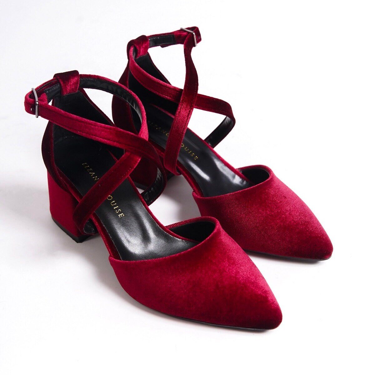 • Made from Red Velvet and Premium Vegan Leather, our shoes are equipped with an ankle strap that provides comfort throughout the day.