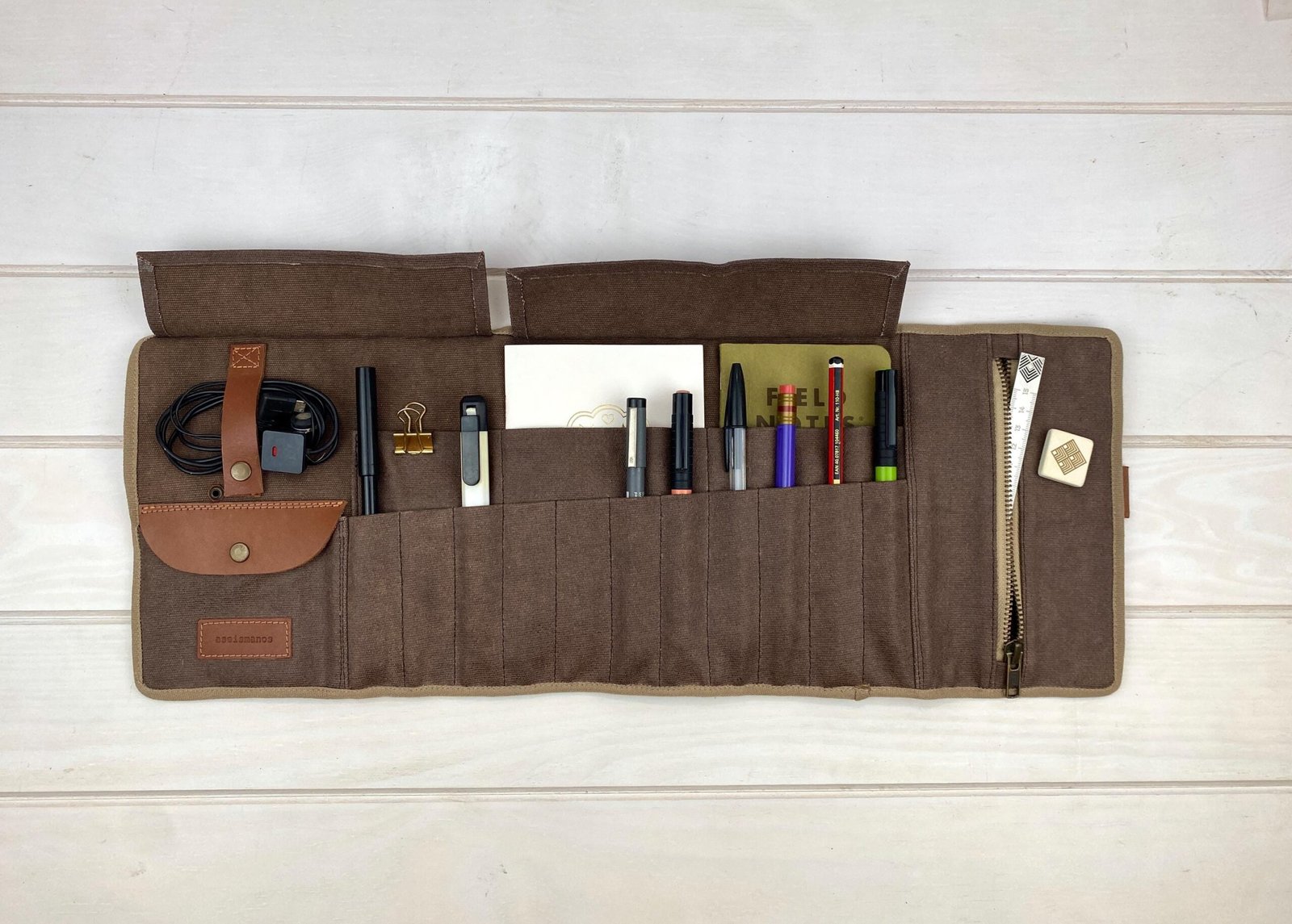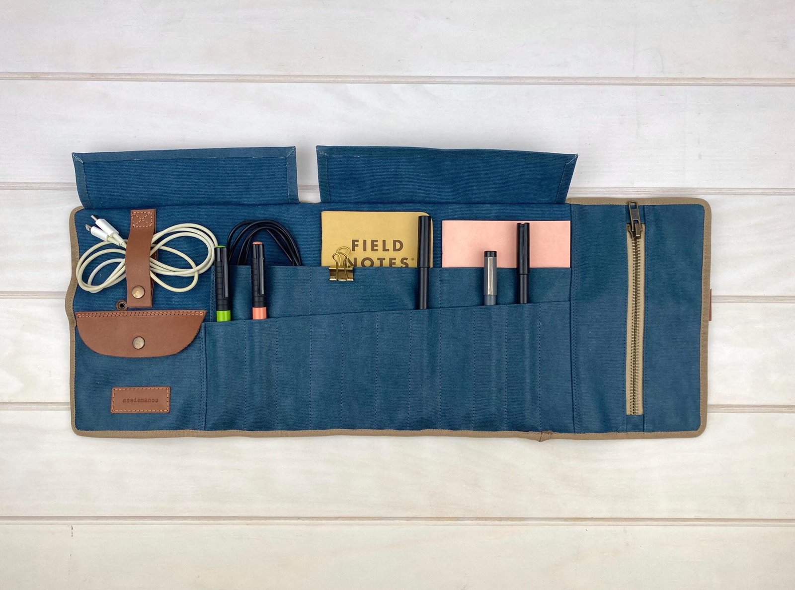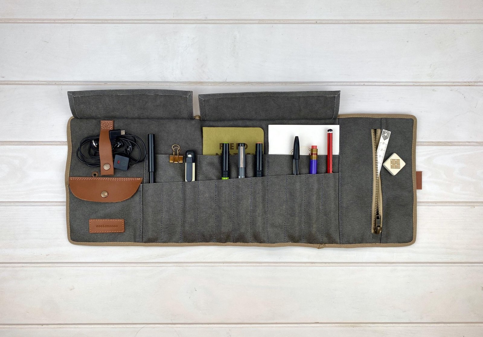It also has space for smaller field notebooks, phone, etc inside, pockets, & still wraps up into an efficient bundle. Perfect for in the field or at home.