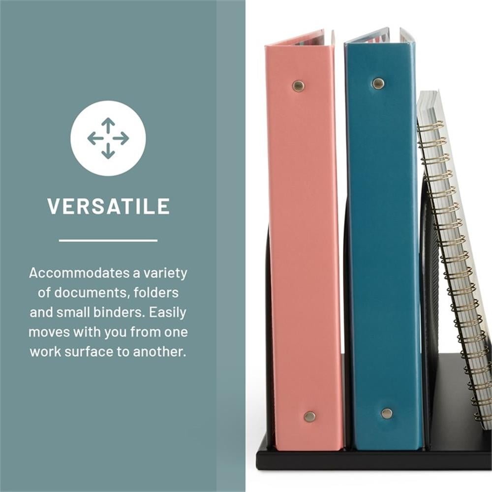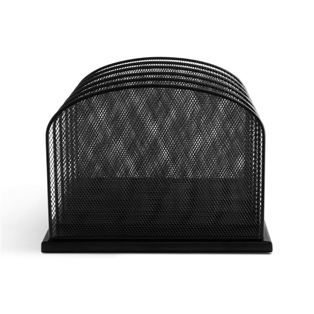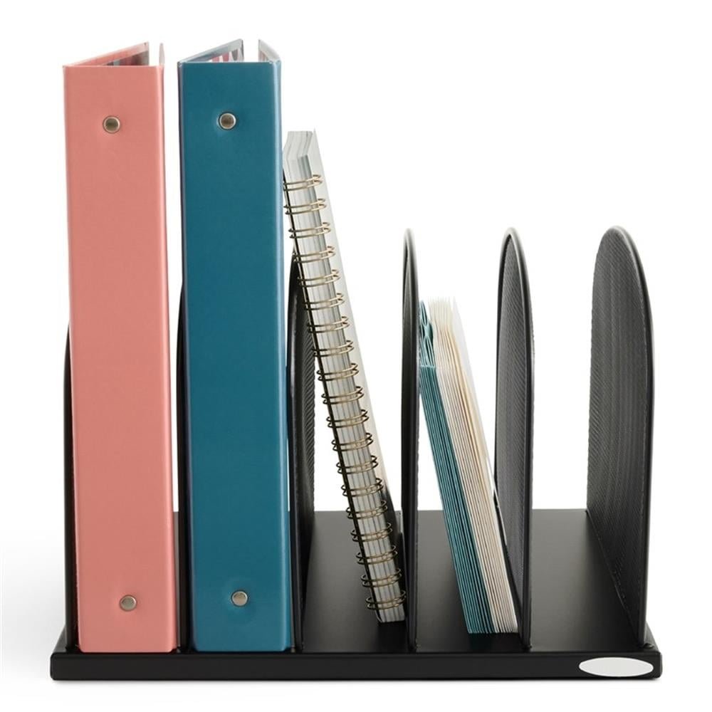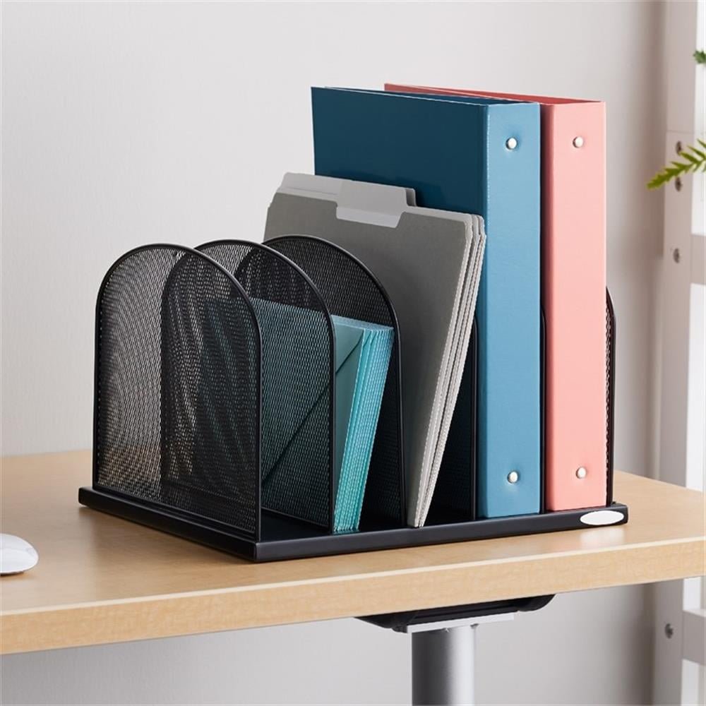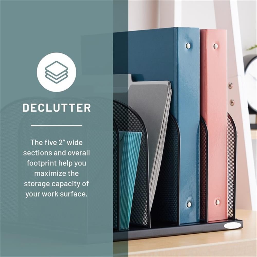 Onyx Mesh 5 Sort Vertical Desktop Organizer keeps essential files and documents organized and within easy reach. The stronger, thicker, commercial-grade mesh steel provides stability while the powder coat finish helps reduce chipping and scratching for years of heavy, repetitive use. Five 2″ wide vertical sections hold file folders, cookbooks, homework, journals, and binders. Place it in business and home offices, cubicles, mail-rooms, school rooms, hobby rooms, and on work desks and communal tables for a long-lasting workspace declutter solution. The Onyx Family includes a diverse collection of stylishly-designed steel mesh products, from desktop organizers to machine stands. Onyx makes it easy to create a sleek, professional, organized workspace. Color: Black. Material: Steel