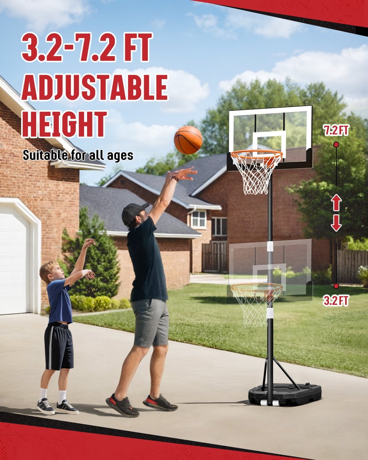- Easy Height Adjustment for Growing Players: Quickly adjust the hoop from 3.2 to 7.2 feet without tools—perfect for kids, teens, and adults of all ages. Whether they’re just starting or ready for a challenge, this basketball hoop adapts as they grow.
