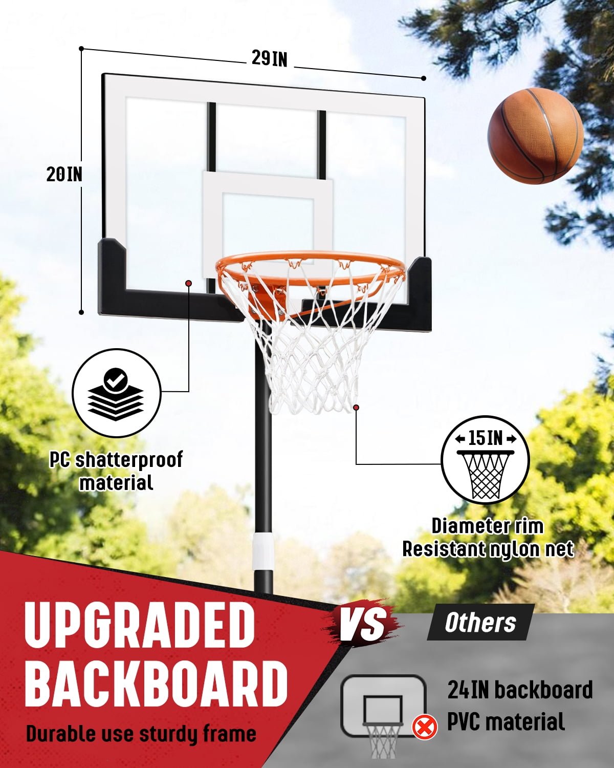 - Built to Last with Premium Materials: Crafted from Q195 steel and a high-strength PC backboard, this hoop is designed for durability and performance in all weather. The 29 inch backboard enhances shot accuracy, and the weatherproof net is perfect for year-round use.
