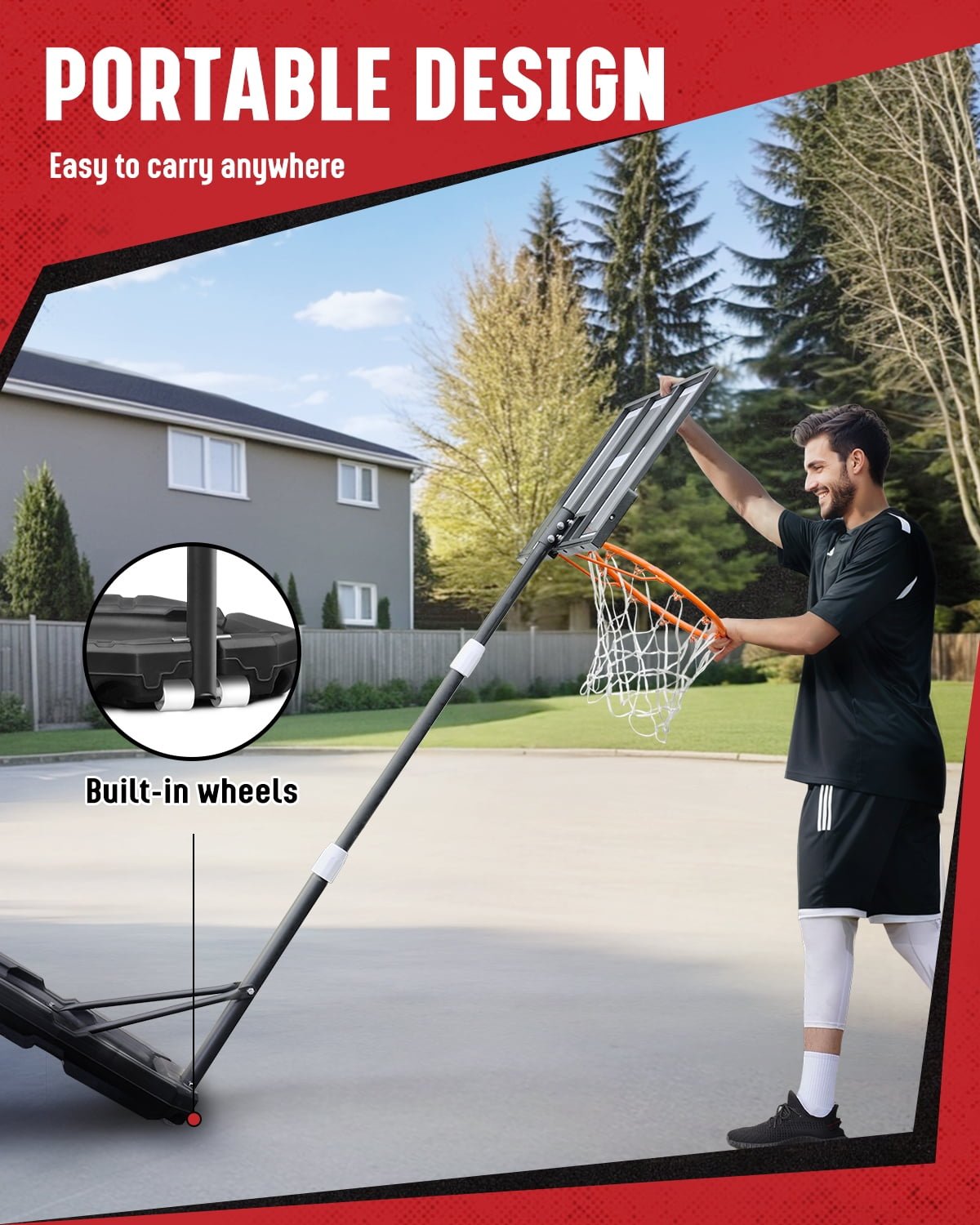 - Portable & Convenient for Any Location: Easily move the hoop with the two built-in front wheels. Ideal for a variety of locations—whether in your yard, garage, living room, or on the beach—this hoop is perfect for family gatherings, outdoor games, and sports events.