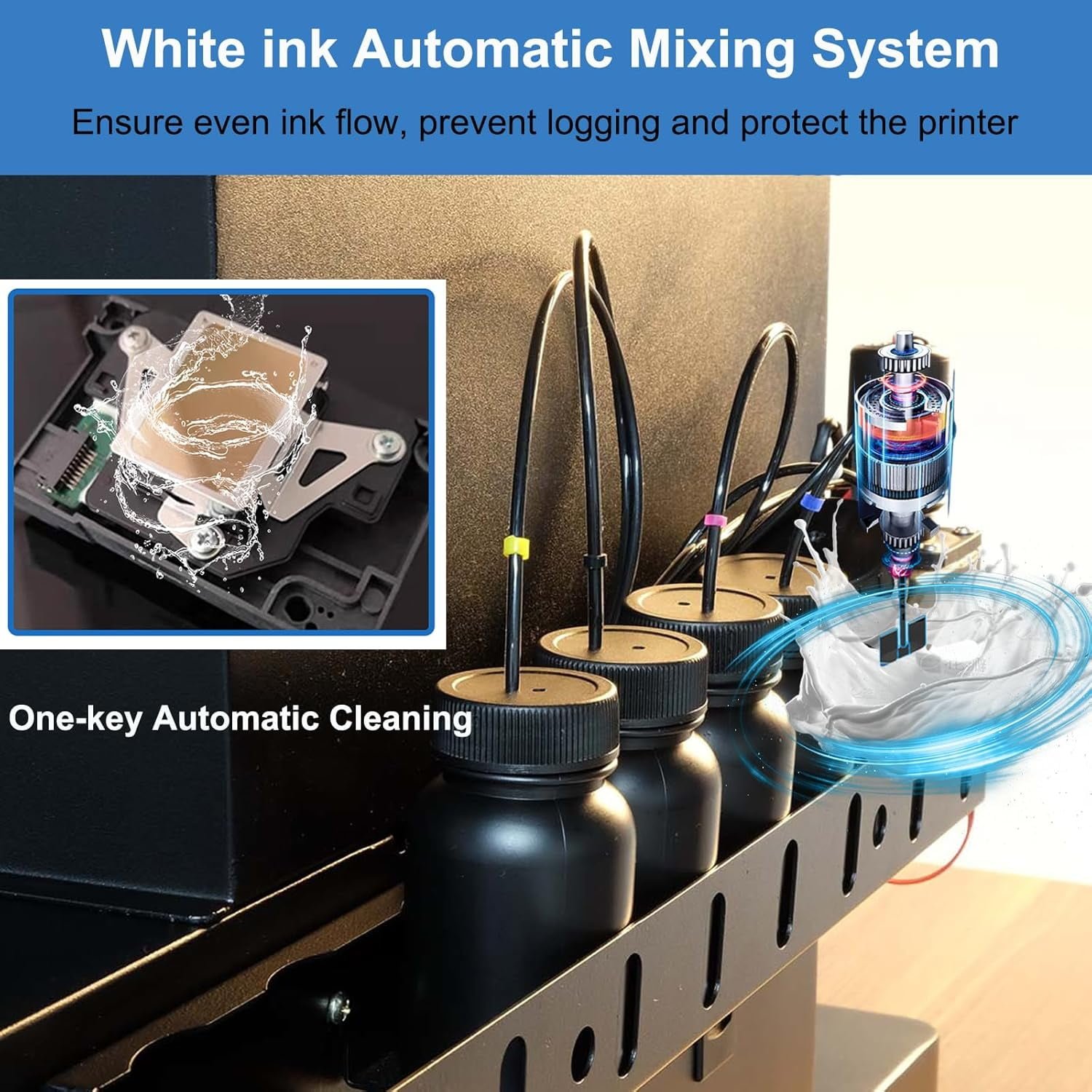 - 【White Ink Circulation System】 Features a white ink mixing system, white ink recirculation system and auto-cleaning function, effectively prevents sediment causing the nozzle to be blocked. Automatic warming when lack of ink, reduce losses for empty printing.