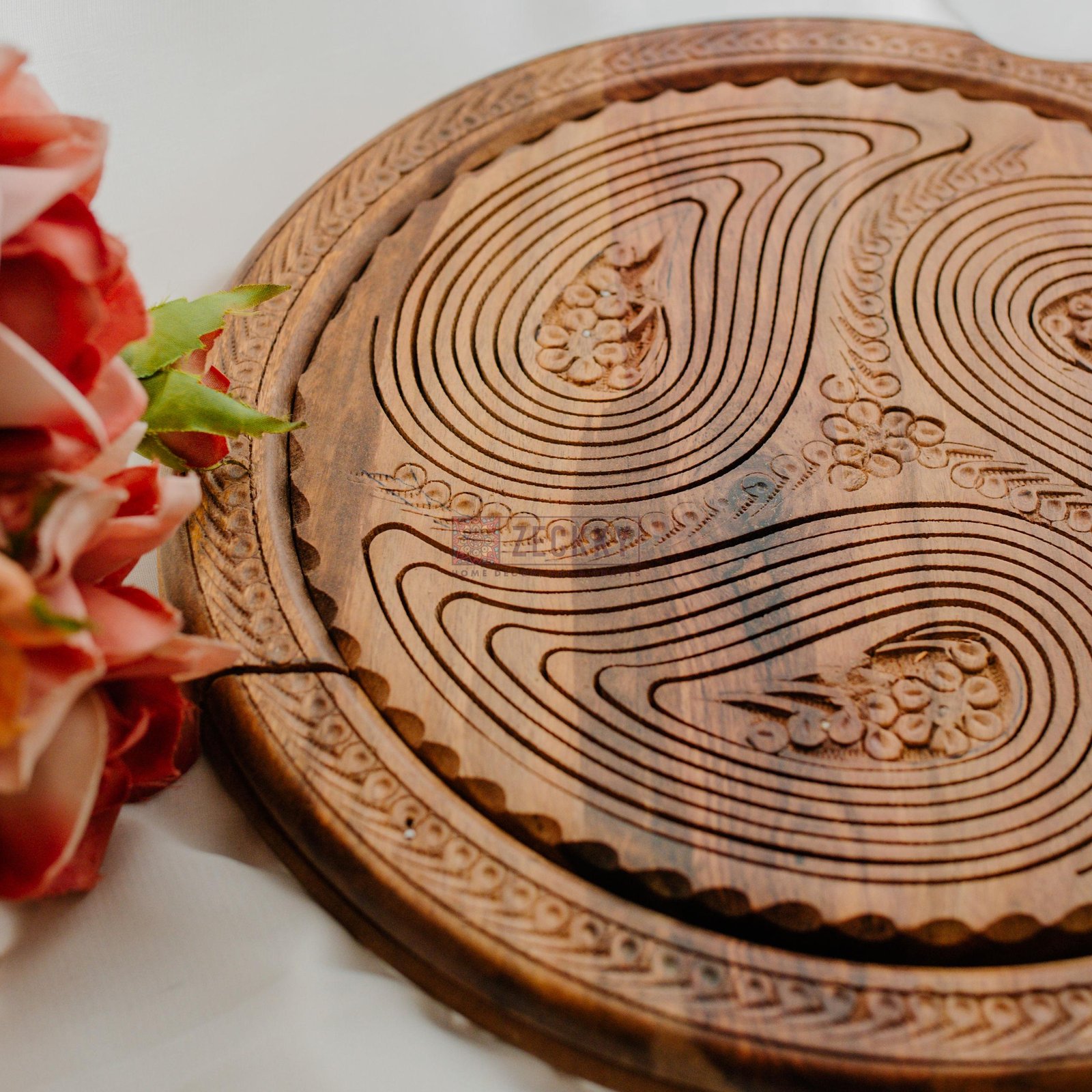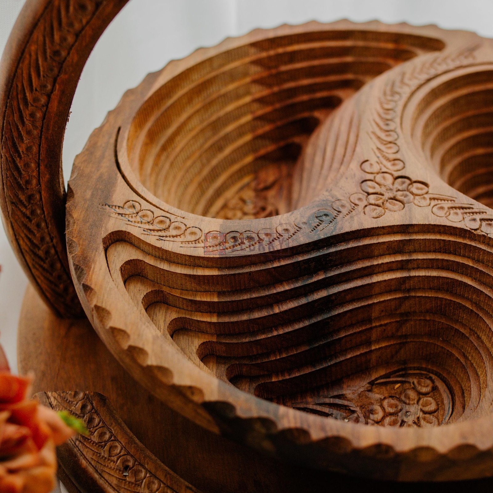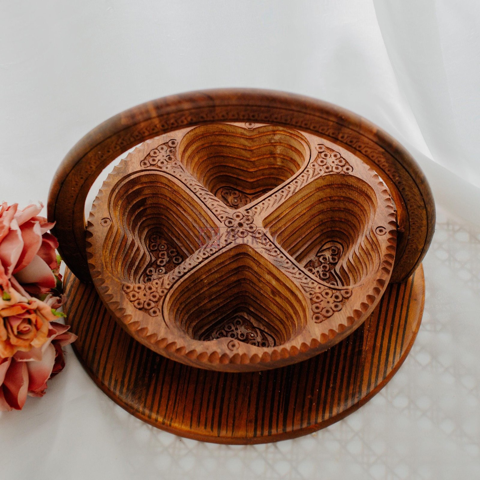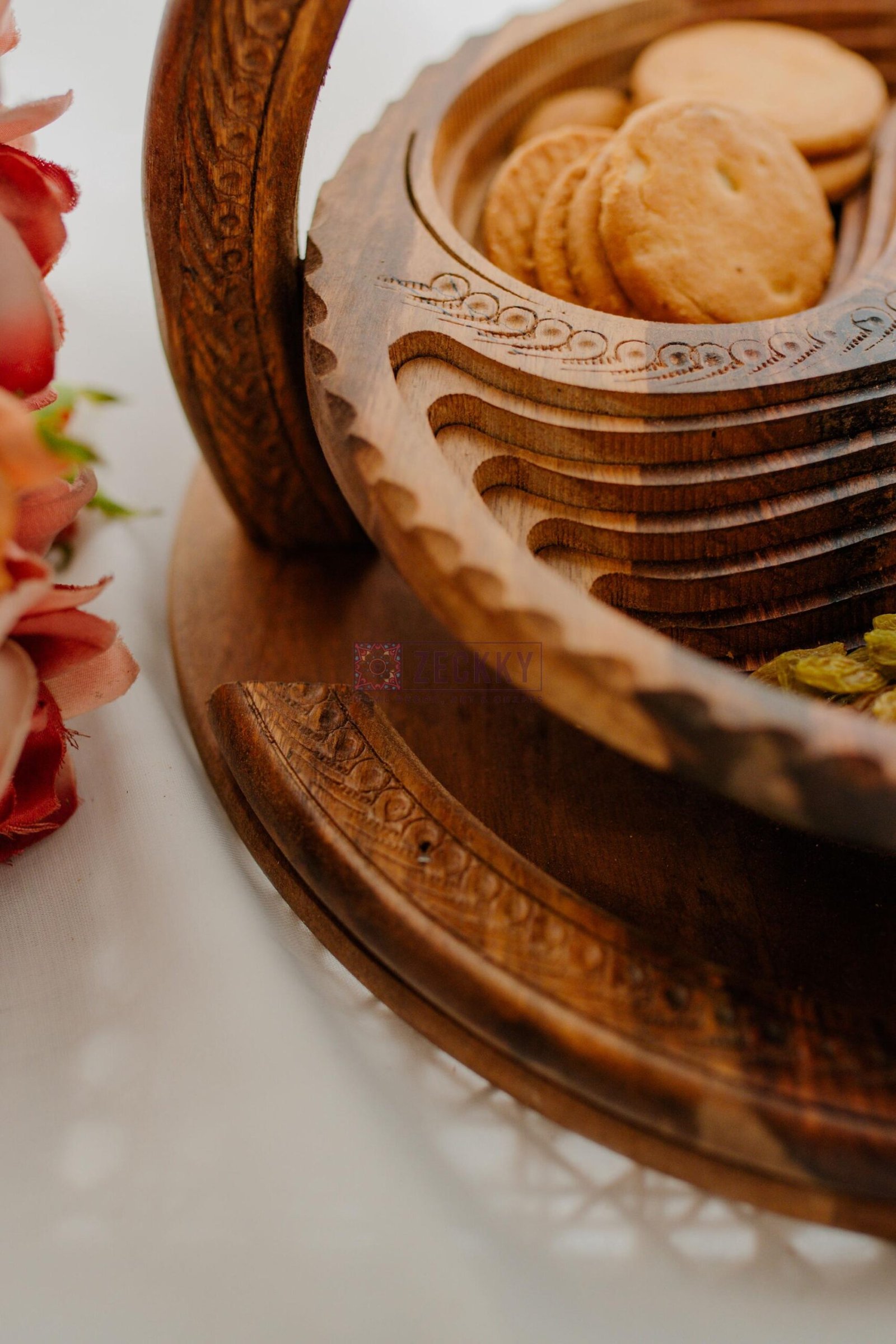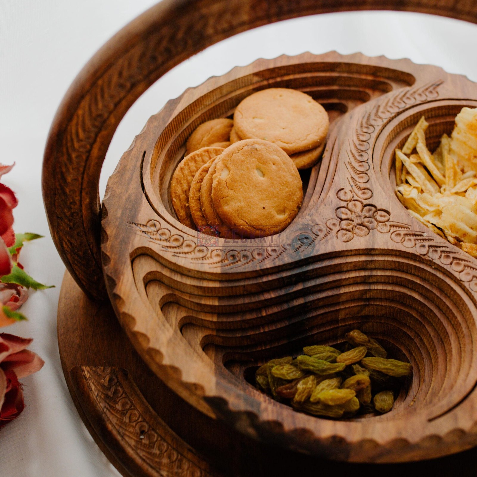 This beautifully handcrafted wooden snacks basket combines rustic charm with modern functionality, making it a perfect addition to your living room or kitchen. The basket features intricate carvings that showcase traditional craftsmanship, adding an elegant touch to any setting. With its convenient handle and multiple compartments, it doubles as a versatile snacks box or couch bar, ideal for holding a variety of treats such as potato chips, cookies, or even healthy snacks. Its natural wood finish enhances the aesthetic, making it not only a serving tray but also a stylish sofa bar or snacks bar for entertaining guests.