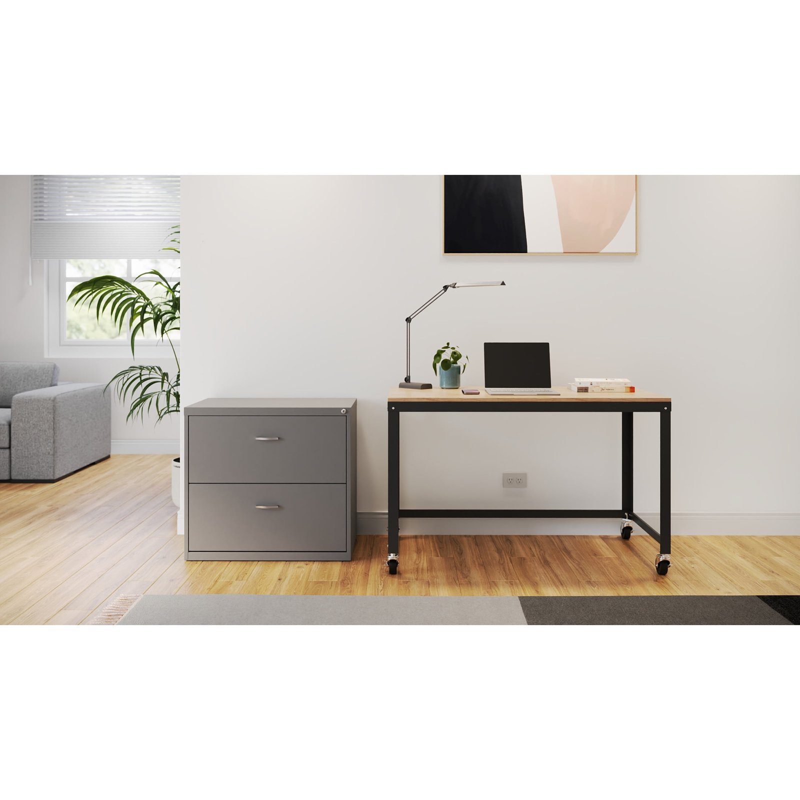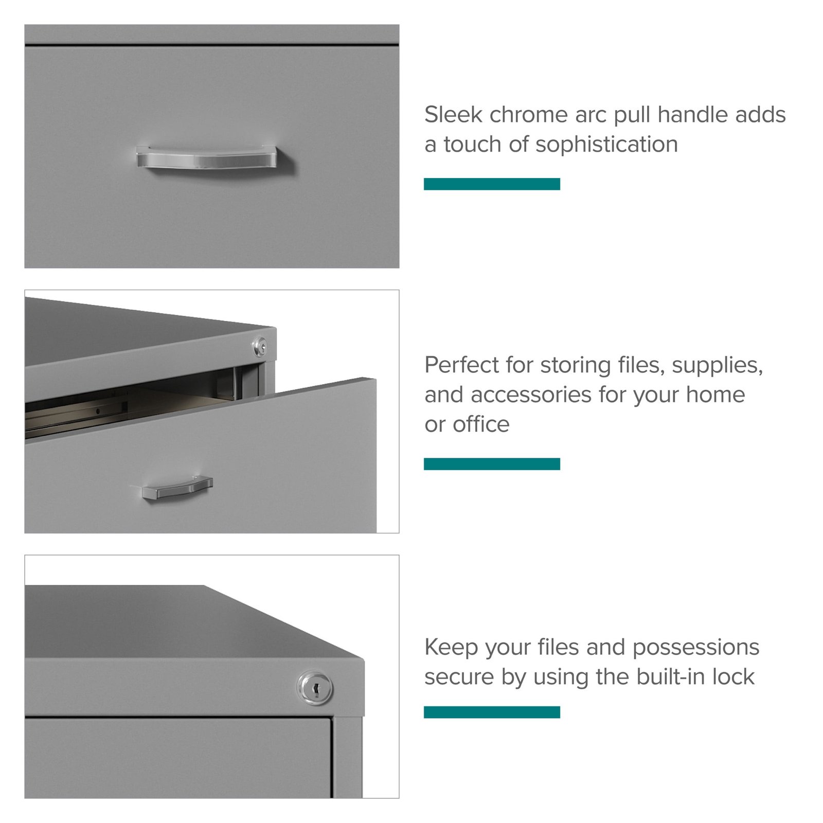 The Two Drawer Lateral File Cabinet is perfect for storing files, office supplies, and accessories for your home or office. This storage solution features durable steel construction and two drawers. Each drawer features high sides to accommodate letter or legal sized hanging files. The drawers have a smooth open and close thanks to our patented drawer slide design. The sleek chrome arc pull handle adds a touch of sophistication. In addition, you can keep your files and possessions secure by using the built-in filing cabinet lock. The painted steel surface is non-porous and easy to clean. Bring organization and function to your home office or professional office with this metal file cabinet. Color: Arctic Silver
