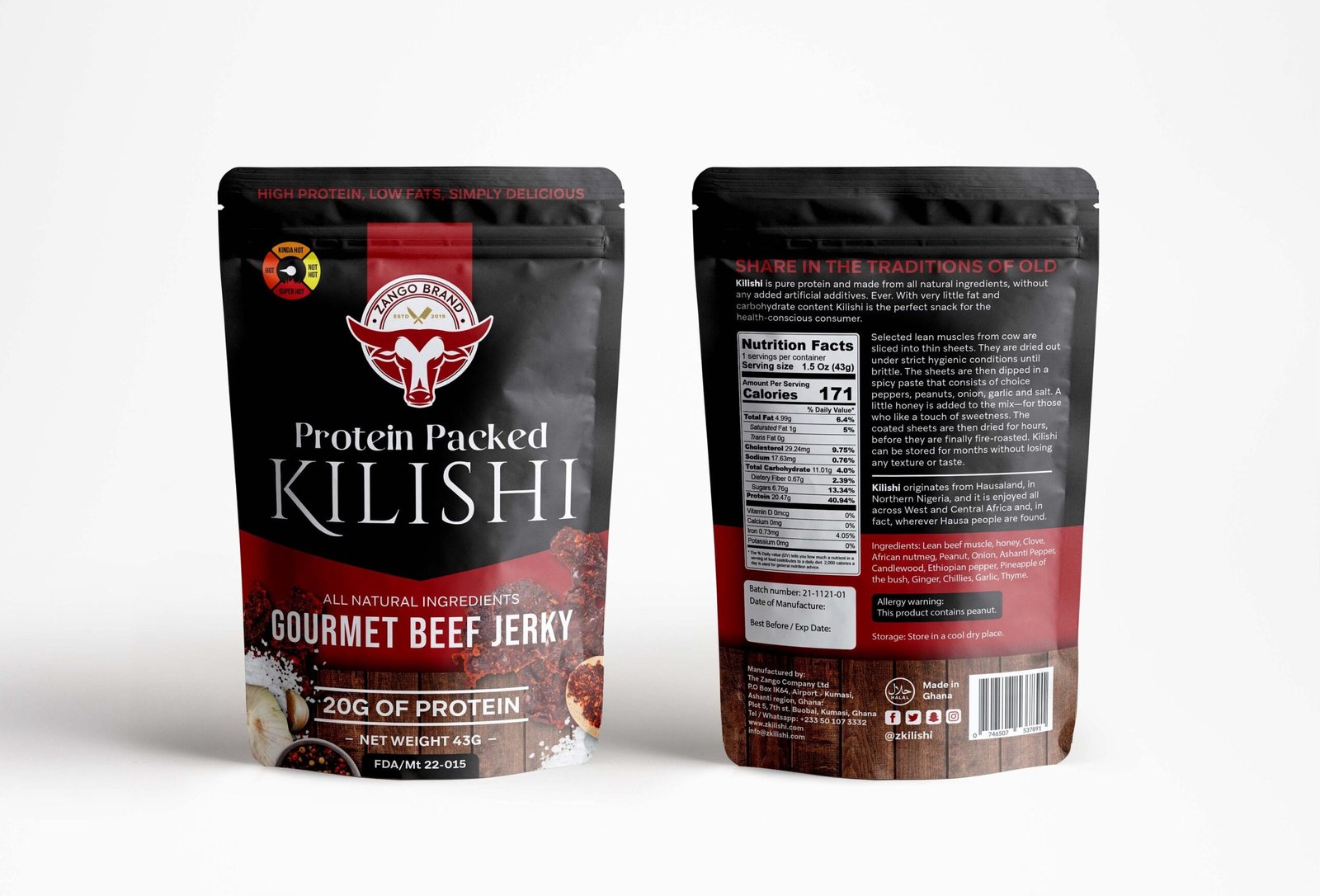 Selected lean muscles from cow, are sliced into thin sheets of about 18 inches. They are dried out under strict hygienic conditions in the sun until brittle. The dried sheets are dipped in a spicy paste that consists of choice peppers, peanuts, onion, garlic and salt. Sometimes a little honey is added to the mix—for those who like a little sweetness. The coated sheets are then dried for hours, before they are finally fire-roasted. Kilishi can be stored for months without losing any texture or taste.