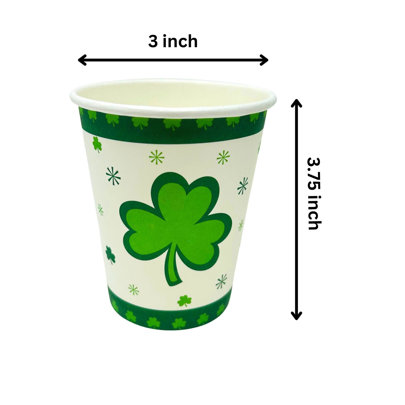 Perfect for your next party or gathering, these cups feature a festive green and white design with shamrocks.