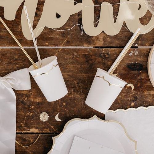 Stunning White and Gold Paper Cups, White Paper Cups, Elegant Paper Cups, White and Gold Tableware, Dinner Party Plates, White and Gold