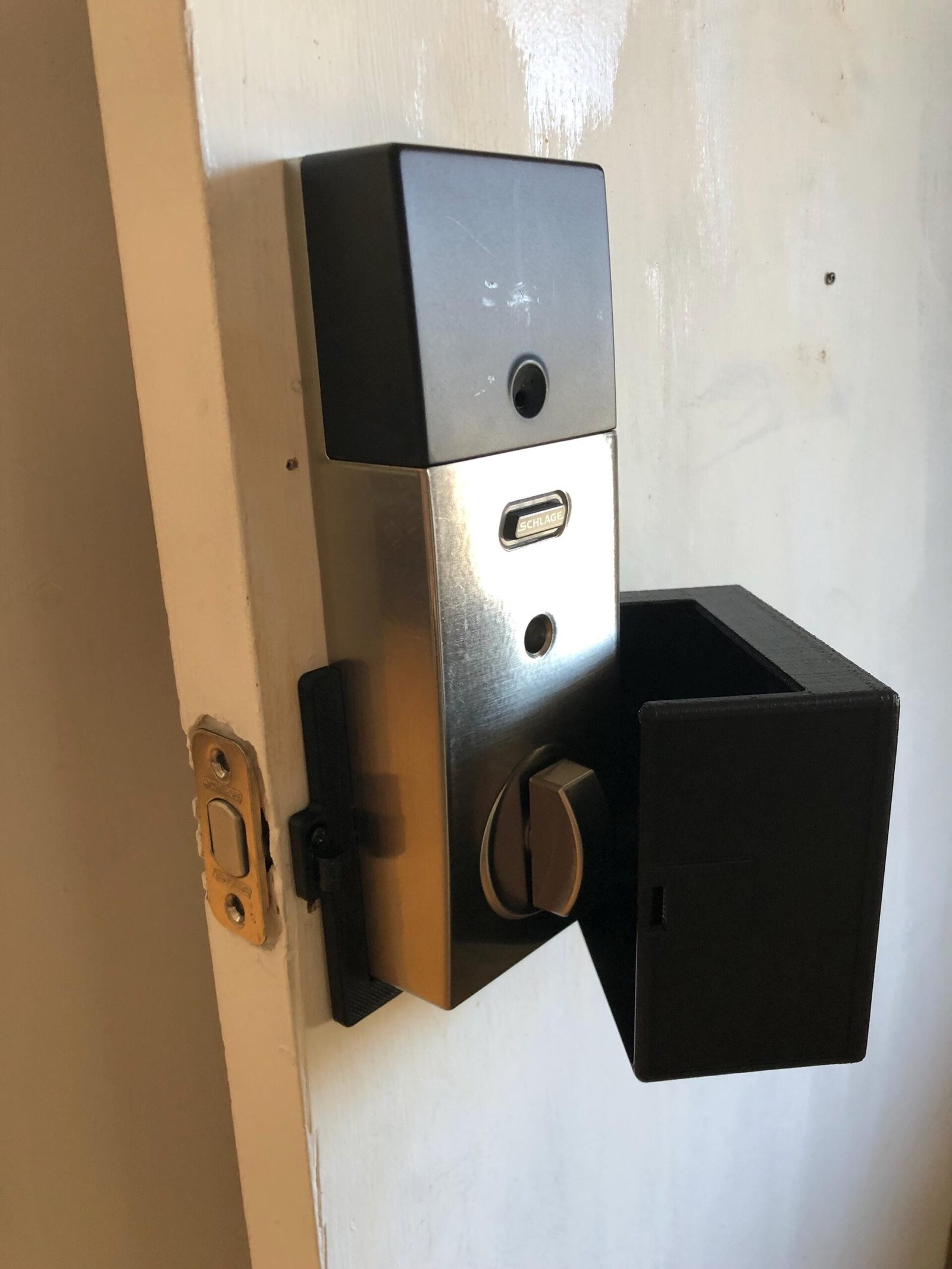This child-proof cover requires a gentle squeeze with an adult-size hand to open. Also useful to prevent patients with dementia from unlocking the front door. The housing can be installed simply over your existing lock installation. Available for various lock models visit www.kwadesignusa.com/faqs for dimensional drawings. Mounts with 2 screws. Made in USA. Pictured smart lock not included.