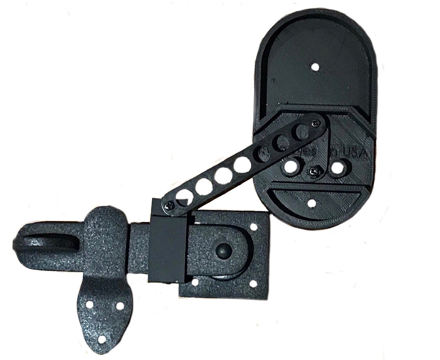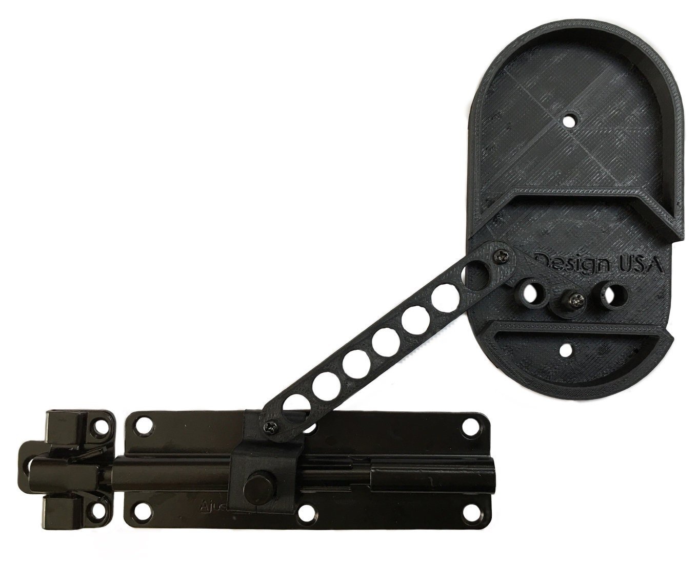 Available in left-closing version bolt slides / latch flips to the left to lock and right-closing version bolt slides / latch flips to the right to lock. Adapter plate made in USA.