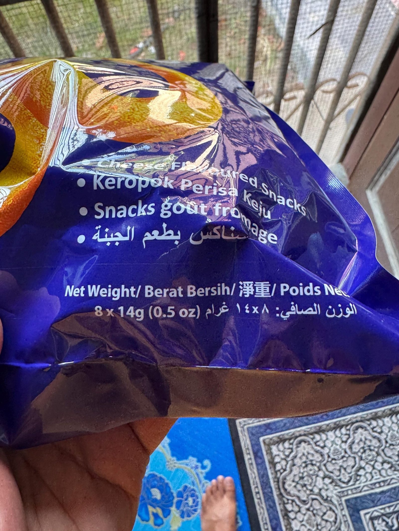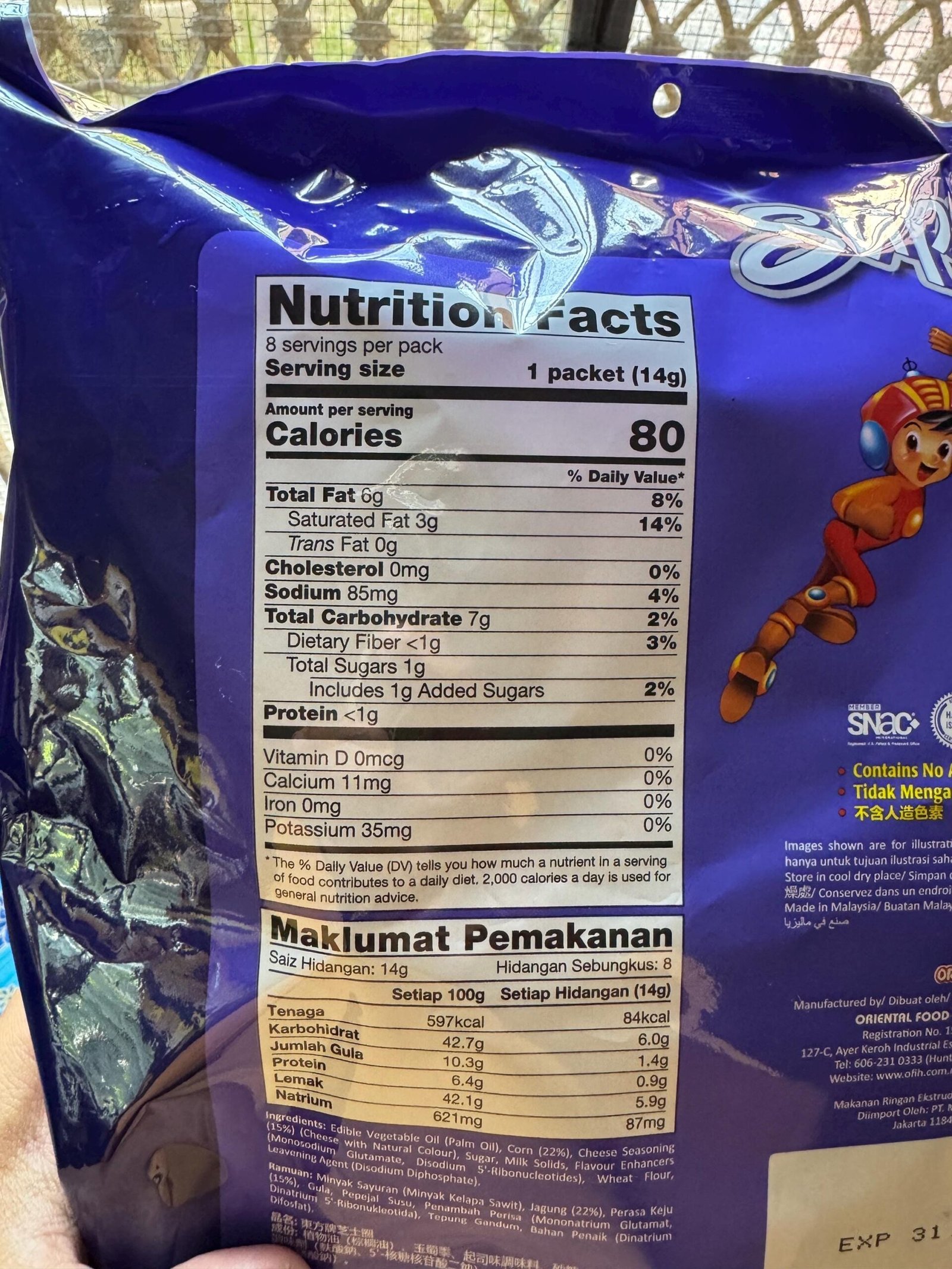 Ingredients: Corn Grits, Cheese Powder Natural Colour Cheese, Vegetable Oil Palm Oil, Sugar, Salt and Monosodium Glutamate.