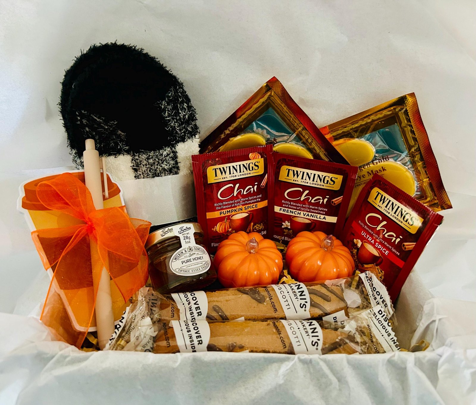 Thanksgiving Gift Box – Fuzzy Socks, Tea, Honey, Biscotti & Pumpkin Tea Light
