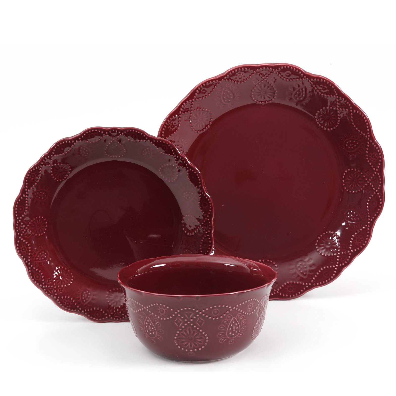 Bring casual elegance to your table with the Pioneer Woman Cowgirl Lace 12-Piece Dinnerware Set. The Cowgirl Lace is a great set that brings a little country charm to both casual everyday dining as well as formal occasions. The set features a beautiful embossed bead pattern and a scalloped design shape that bring a distinct elegance to the table. The set is available in a variety of color options that include linen, plum, light blue, red, and teal. Mix and match all of the Cowgirl Lace color options along with other The Pioneer Woman dinnerware. Each item is made of durable stoneware and is dishwasher and microwave safe. The Pioneer Woman Cowgirl Lace 12-Piece Dinnerware Set comes with complete service for four including dinner bowls, salad plates, and bowls. Make your meals memorable and elegantly simple with The Pioneer Woman Cowgirl Lace 12-Piece Dinnerware Set.