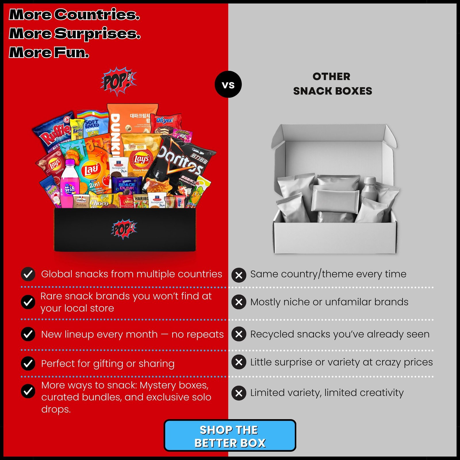 The Plot Twist mystery snack box brings the drama, surprise, and flavor with a lineup of 16 rare snacks from around the world–a major upgrade from our entry-level Teaser.