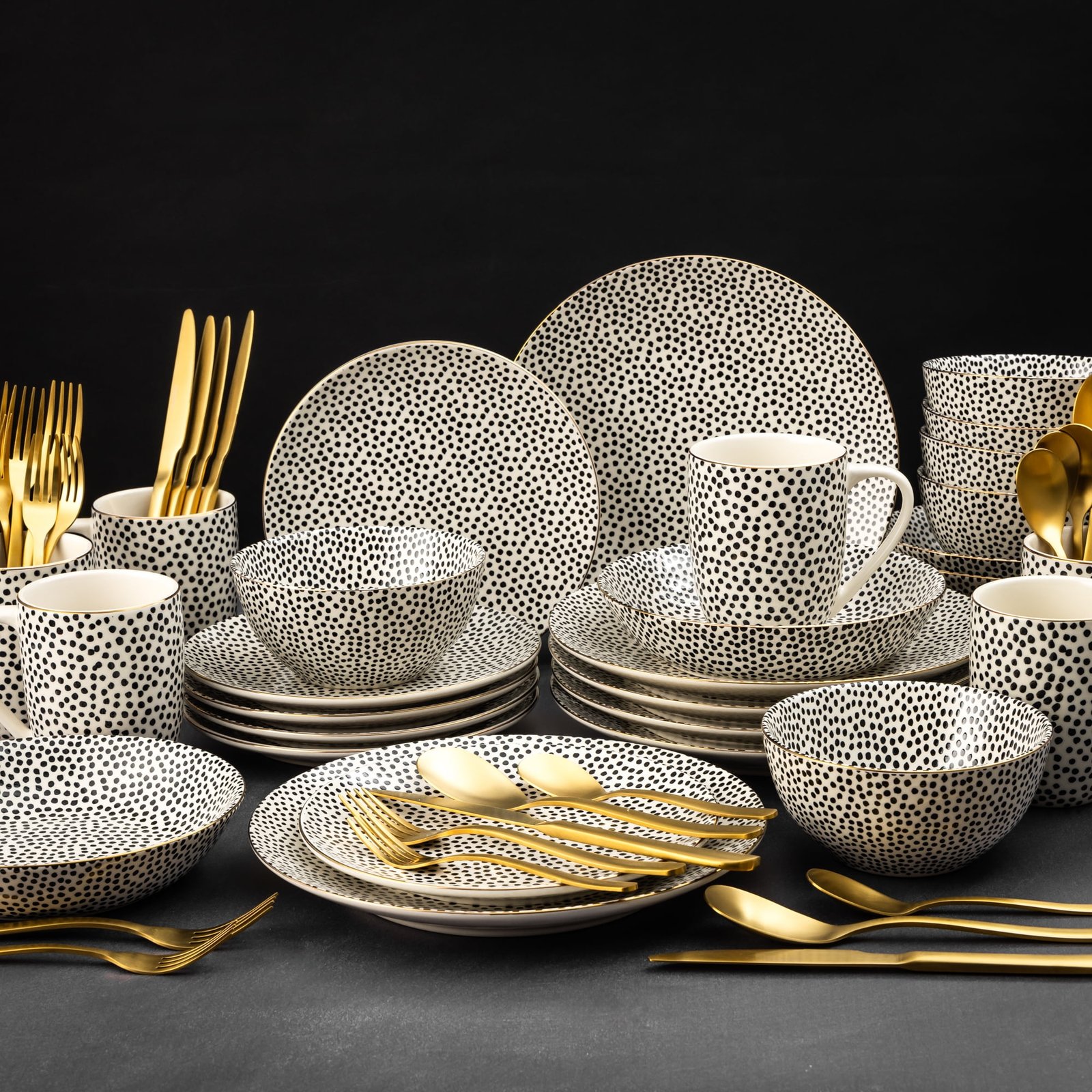 - Luxe Gold Flatware: Crafted to complement the dinnerware, the gold flatware brings a sense of luxury and elegance, elevating any dining occasion.