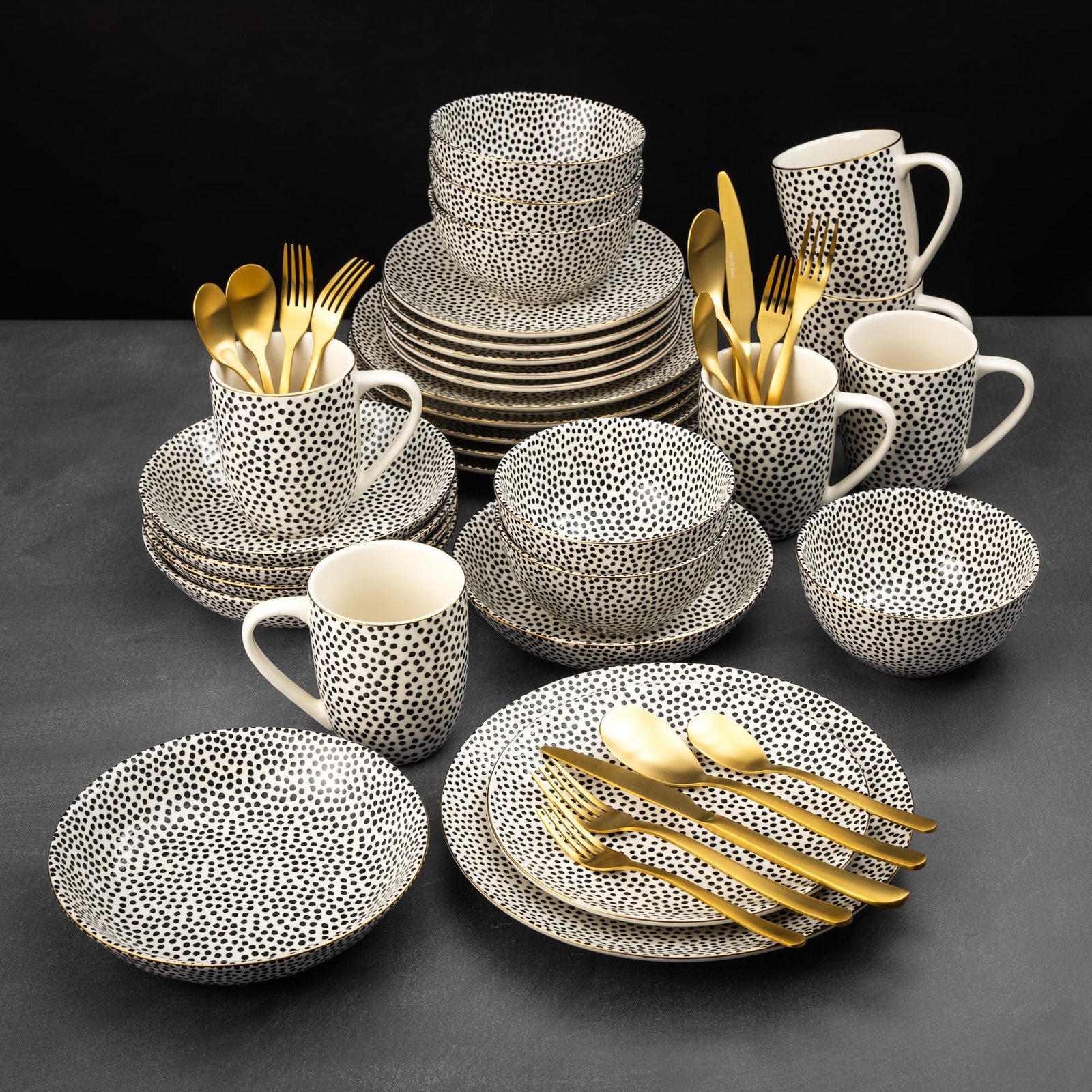 - Complete Service: Includes 6x dinner plates, 6x salad plates, 6x bowls, 6x large bowls, 6x mugs, and a full set of matching 30 piece gold flatware, offering everything you need to set a beautiful table for family and guests
