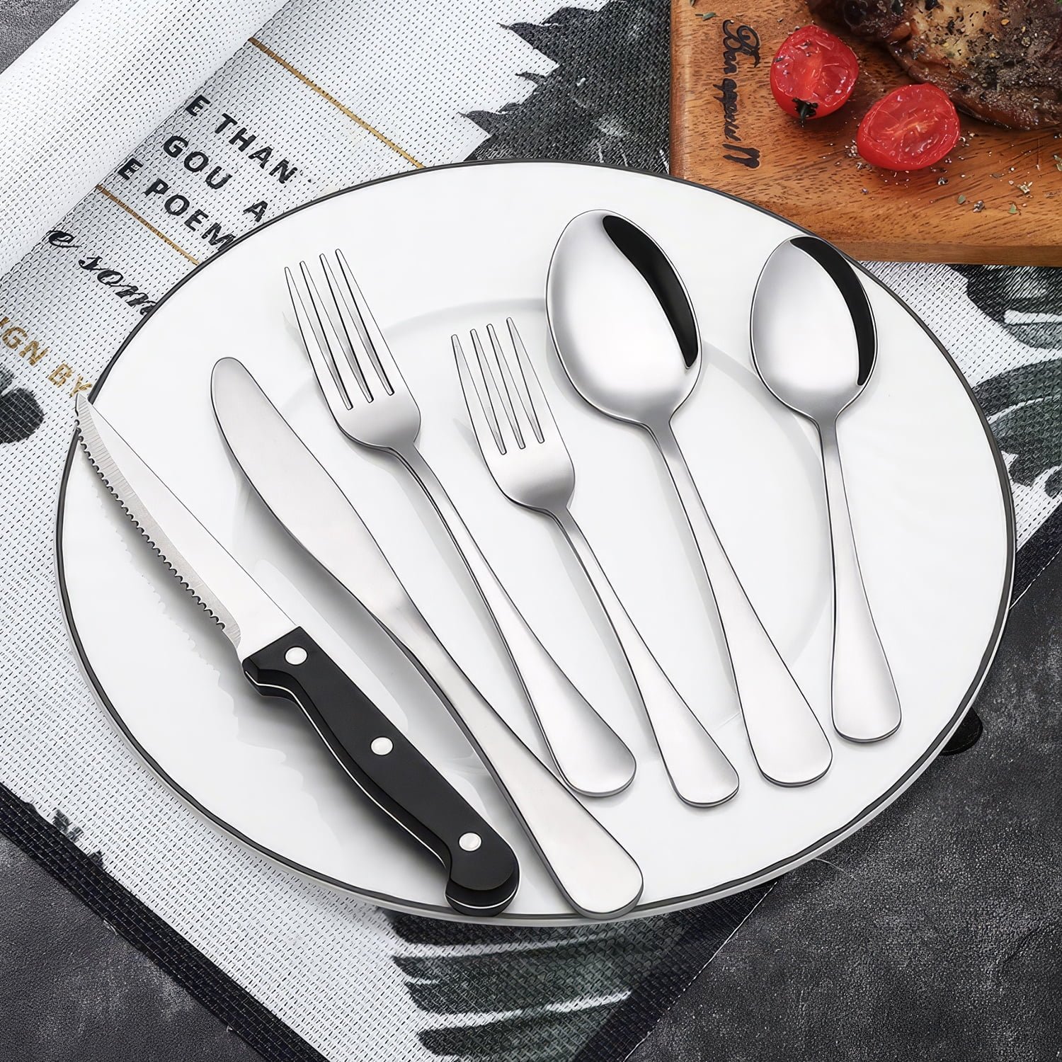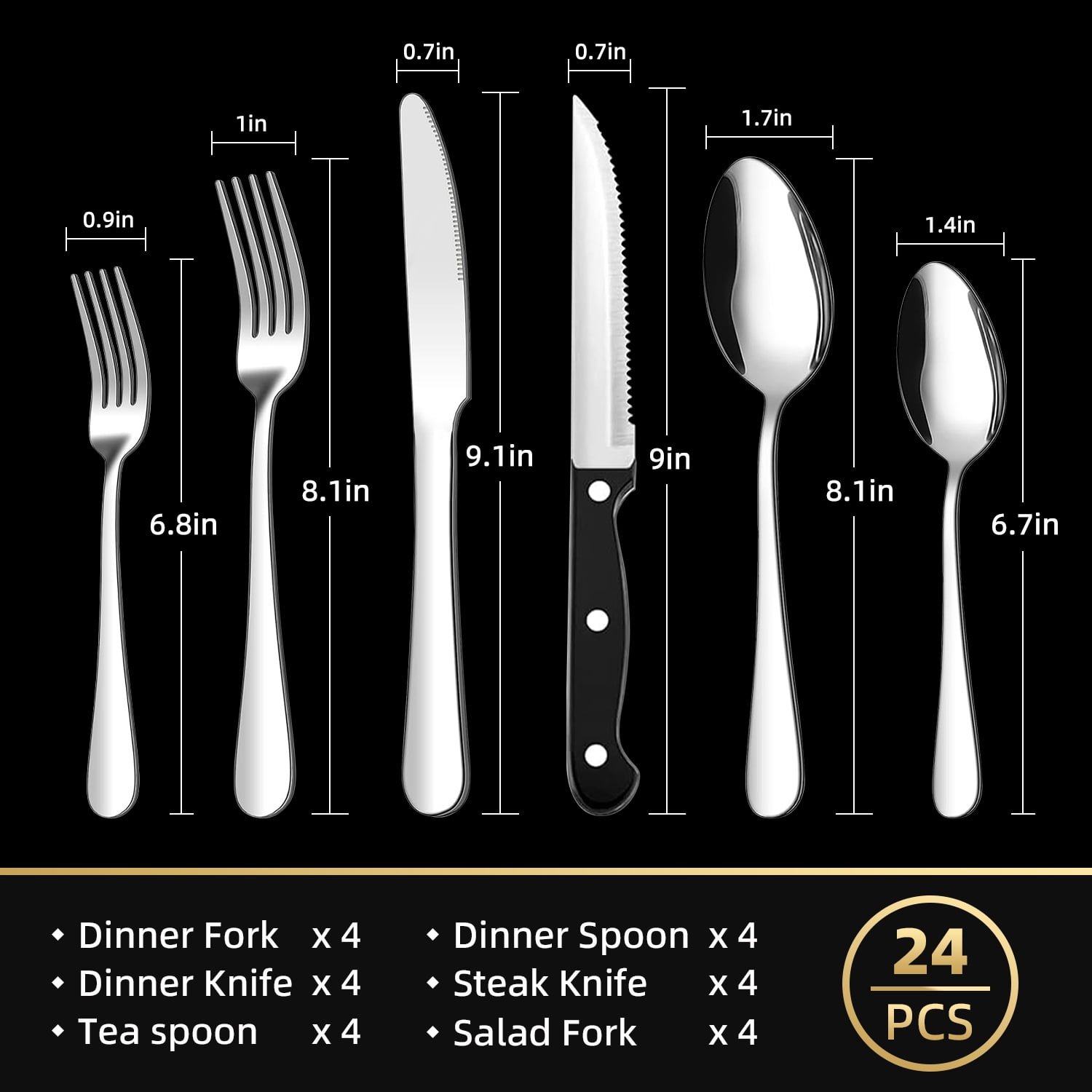 Complete Dining Set for 4:This silverware set includes 24 pieces, featuring 6 each of Dinner Forks, Dinner Spoons, Dinner Knives, Knives, Salad/Dessert Forks, and Dessert/Tea Spoons. It’s perfect for families and restaurants, offering a complete dining solution.Premium Stainless Steel Build:Crafted from high-quality food-grade stainless steel, this flatware set boasts remarkable durability, rust-resistance, and corrosion resistance. The stainless steel is non-toxic and BPA-free, ensuring your safety. Its robust construction guarantees long-lasting use, and the set is dishwasher safe for easy cleaning.Thoughtful Ergonomic Design:The utensil handles are ergonomically designed, taking hand posture into consideration. The set offers a comfortable weight and balance, preventing fatigue during use. The utensils have smooth edges that ensure safety and prevent scratches.Elegance and Fine Craftsmanship:The flatware set showcases a highly mirror-polished finish that highlights its elegant shape and classic design. Its refined appearance adds a touch of sophistication to any dining setting, complementing various home styles and tableware. The set is meticulously crafted with no rough spots or sharp edges, ensuring a comfortable dining experience.Versatile Usage:Beyond everyday use, this cutlery set is perfect for a wide range of occasions. Whether it’s holiday parties, gatherings, weddings, camping trips, or even professional events at restaurants and hotels, this set is versatile and reliable. It’s also a thoughtful and practical gift choice.