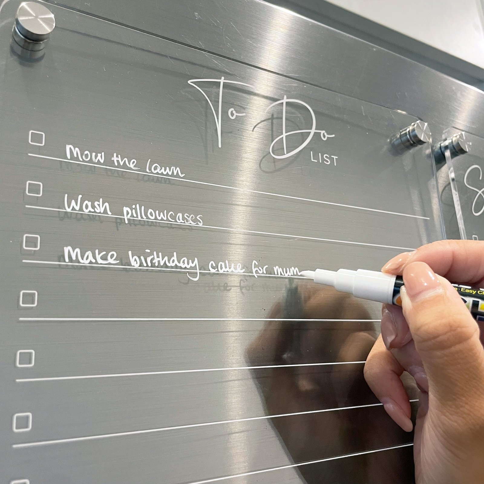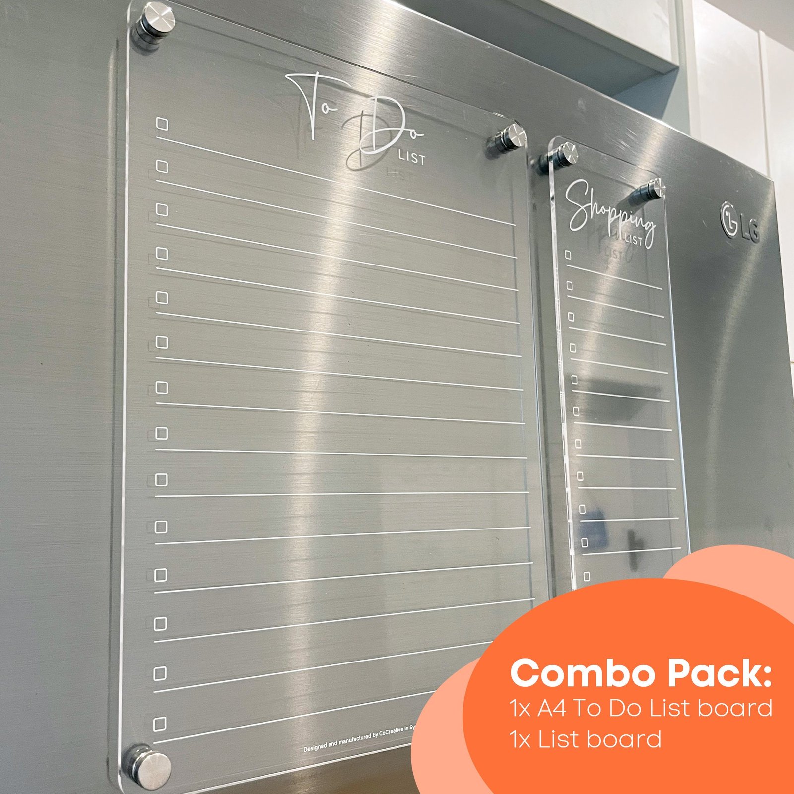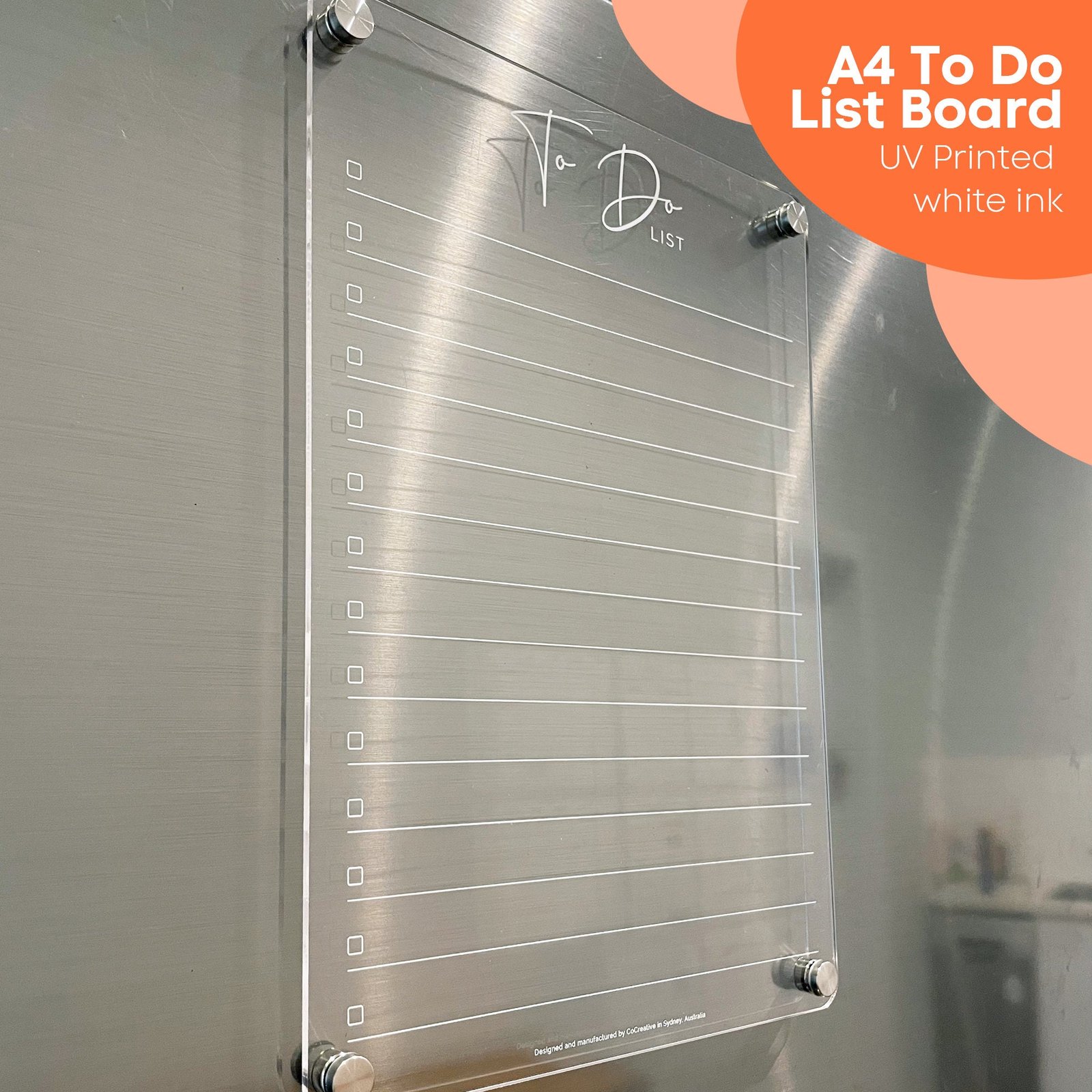 Clear acrylic A4 To Do list in our checklist design for your fridge. Includes magnetic stand-off hardware with a stainless steel finish. Comes assembled with white erasable chalk marker included. Also available as a To Do list and Shopping list combo.
