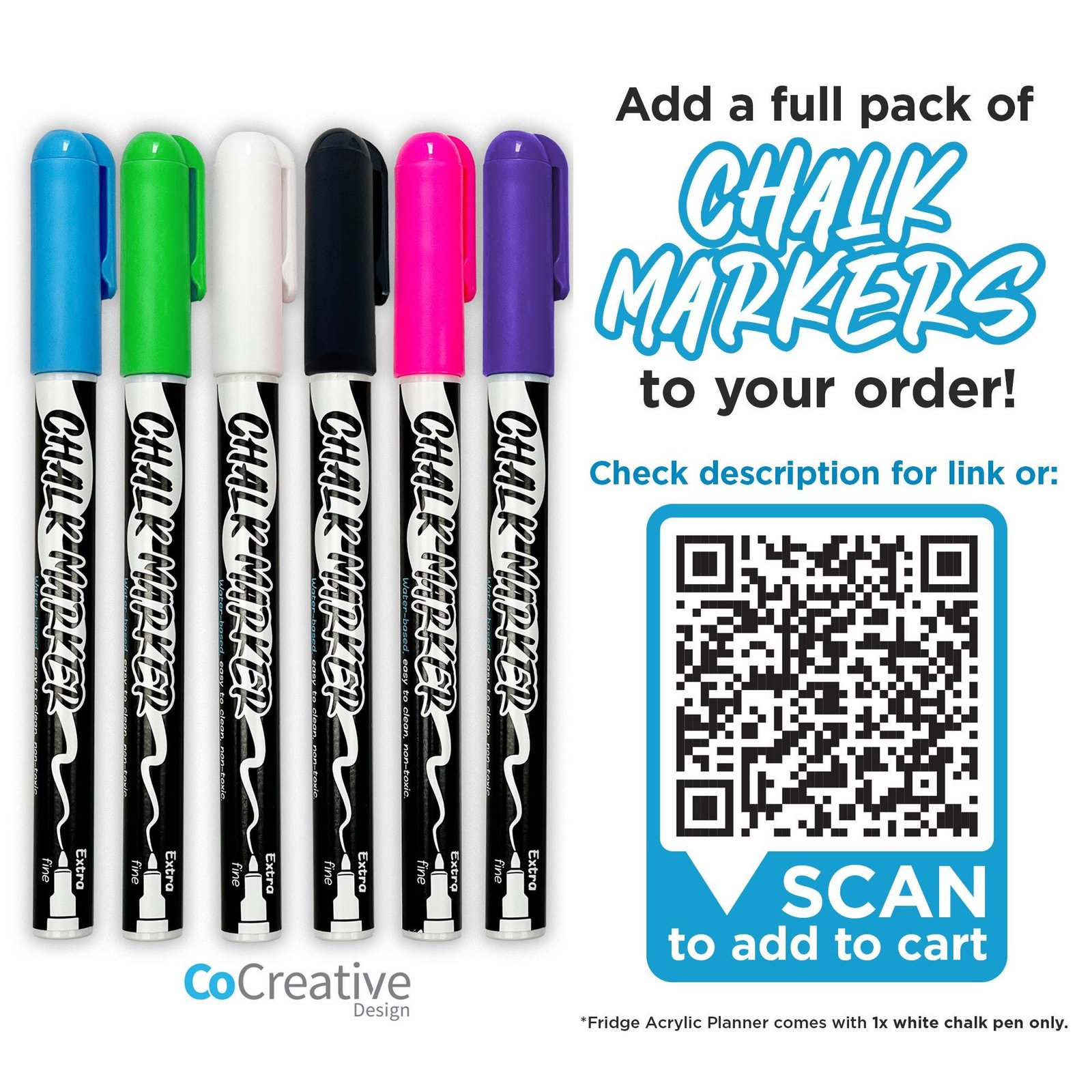 Planner comes with 1x white erasable chalk marker. Grab some extra chalk markers for all your planning needs, with additional colours: https://www.etsy.com/au/listing/1745447028/6-pack-extra-fine-chalk-markers