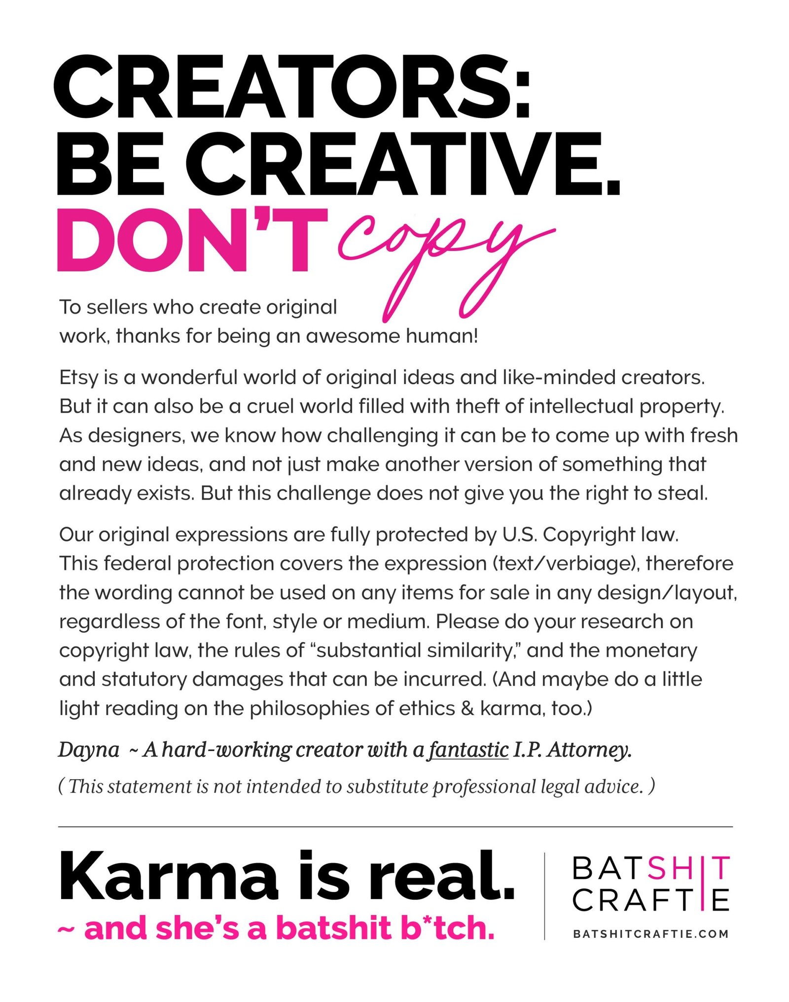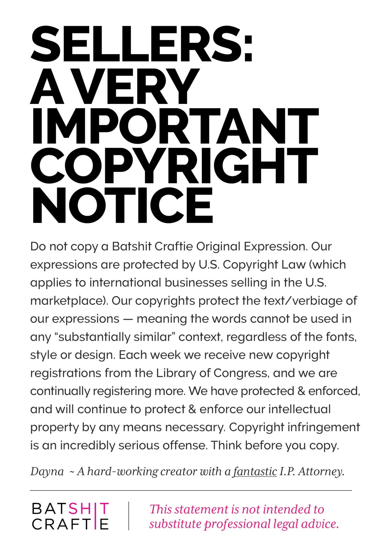 This original expression is fully protected by U.S. Copyright law. This federal protection covers the expression text/verbiage on this item, therefore the wording cannot be used on any items for sale in any design/layout, regardless of the font, style or medium. It is also a violation of federal law to create a “substantially similar” version of this wording. U.S. Copyright law applies to international sellers who are selling the in the U.S. Marketplace.