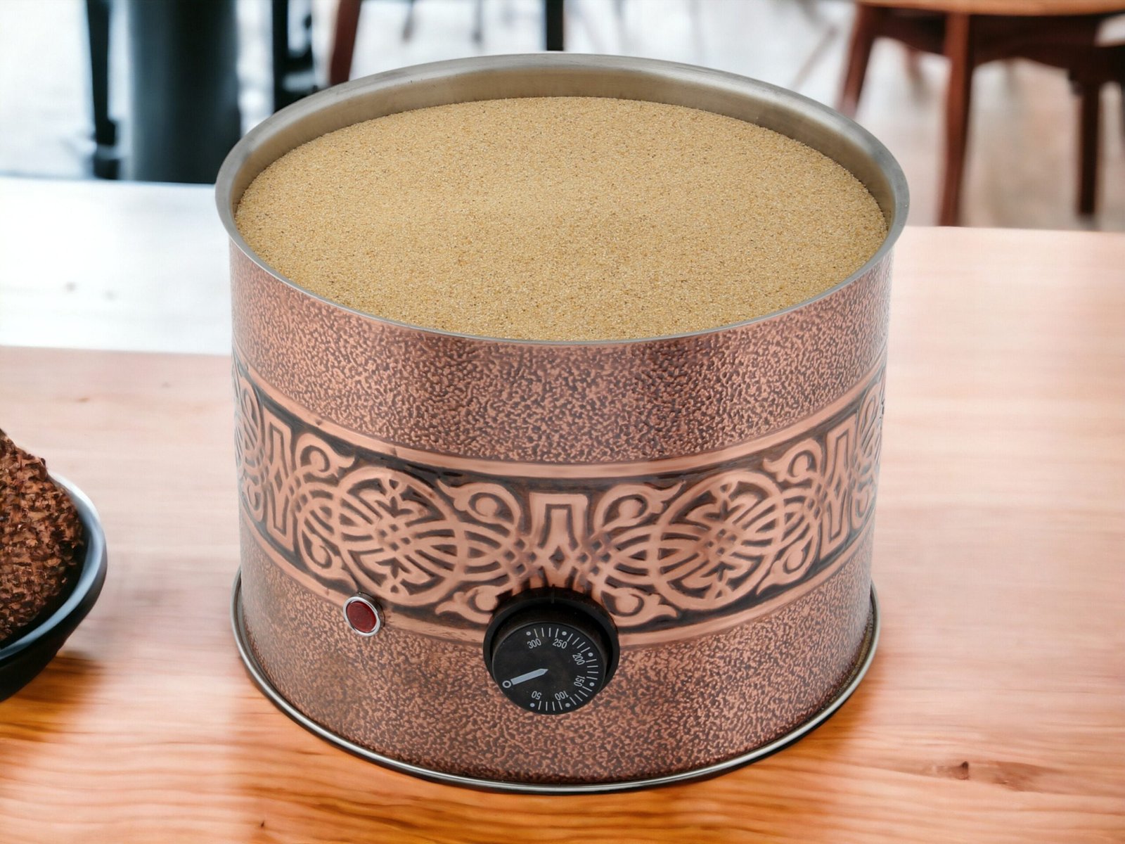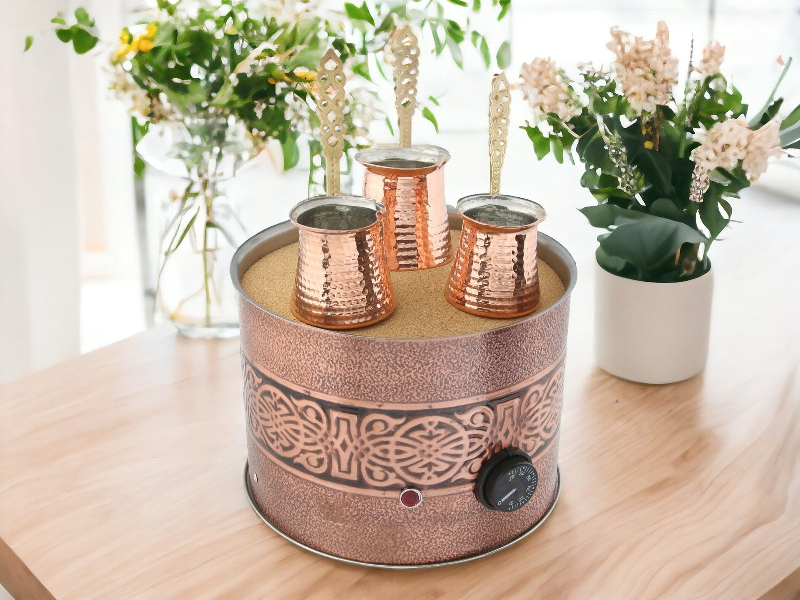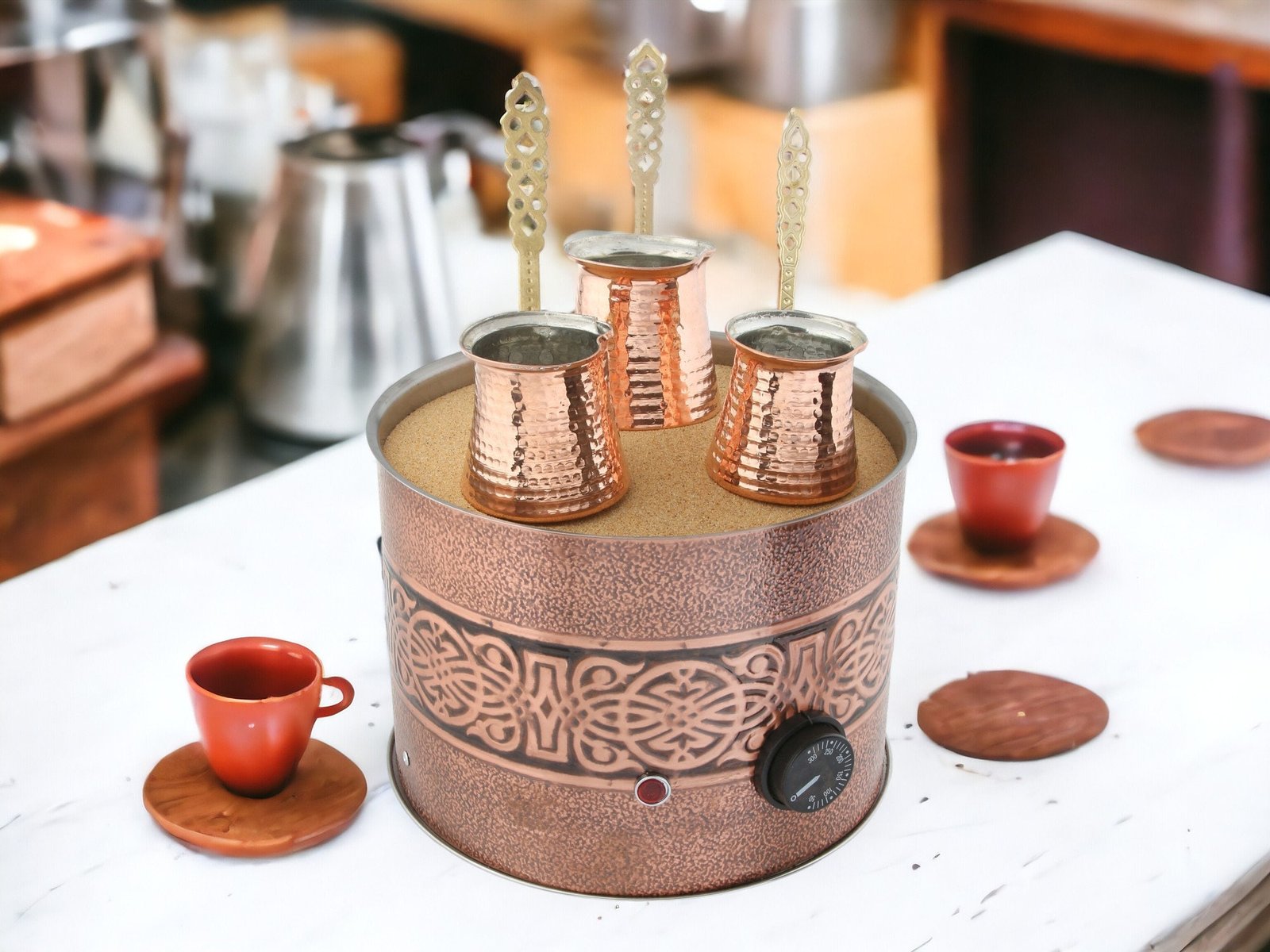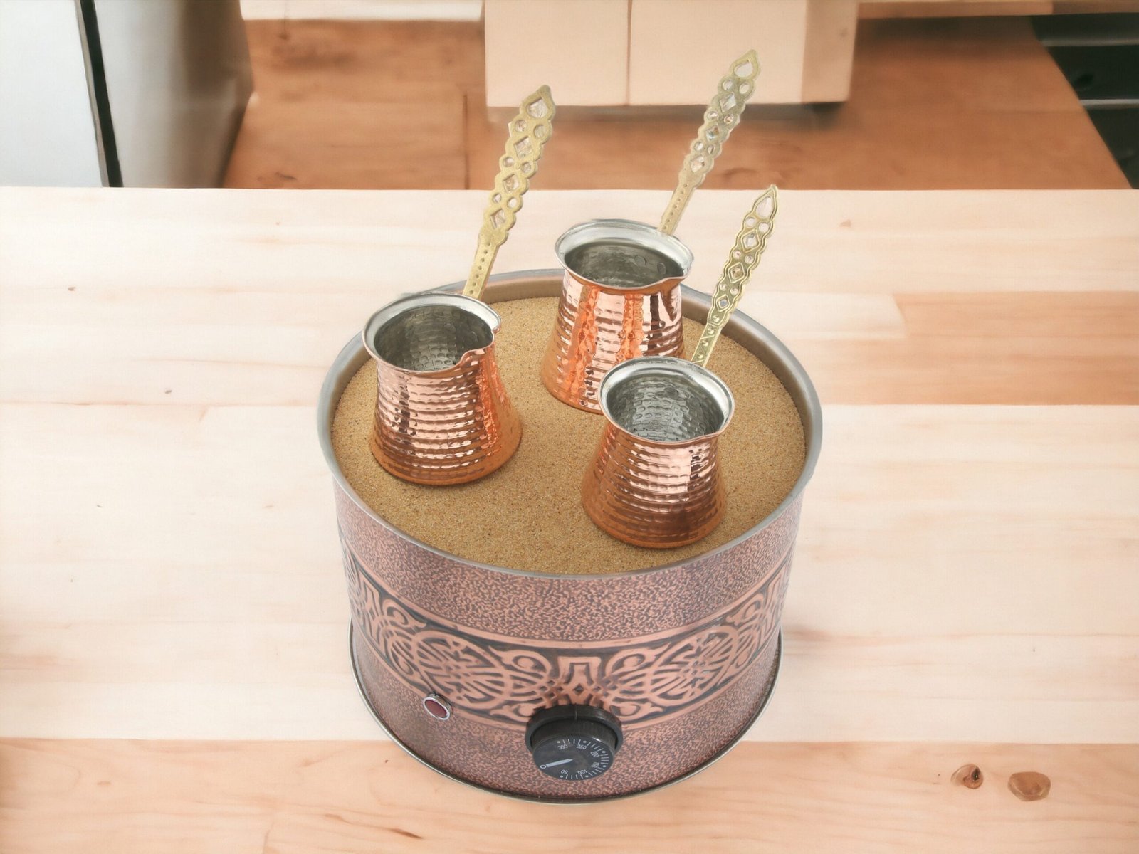 Traditional Copper Turkish Heating Sand Coffee Maker Circle Medium Geometrical Design With Three Pots Set – Machine 110 ~ 230 Volt