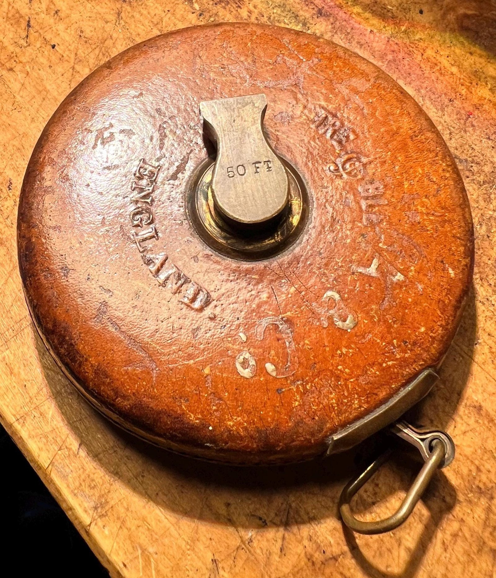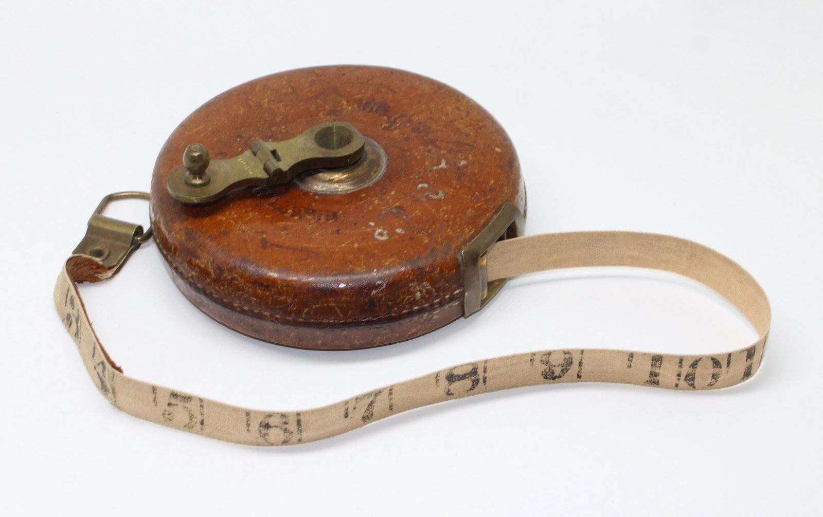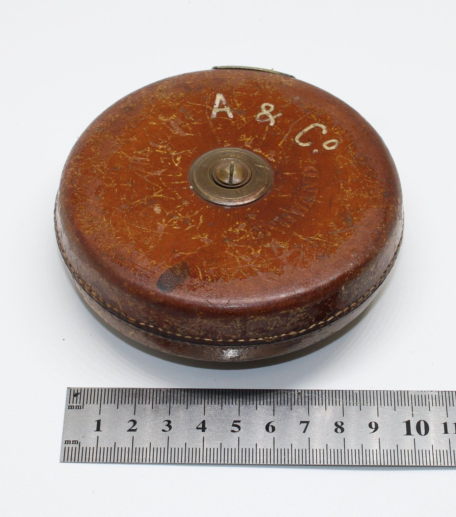 Made in Sheffield in the 1930s, this lovely item is a vintage leather and brass Chesterman Treble Clef tape measure. It is 50ft long and the measurements on the cloth tape are in inches/feet. It measures just 10.5cm wide, which is smaller than most Chesterman measures of this period. The original owner was ‘A & Co’ and their company name is marked on each side.