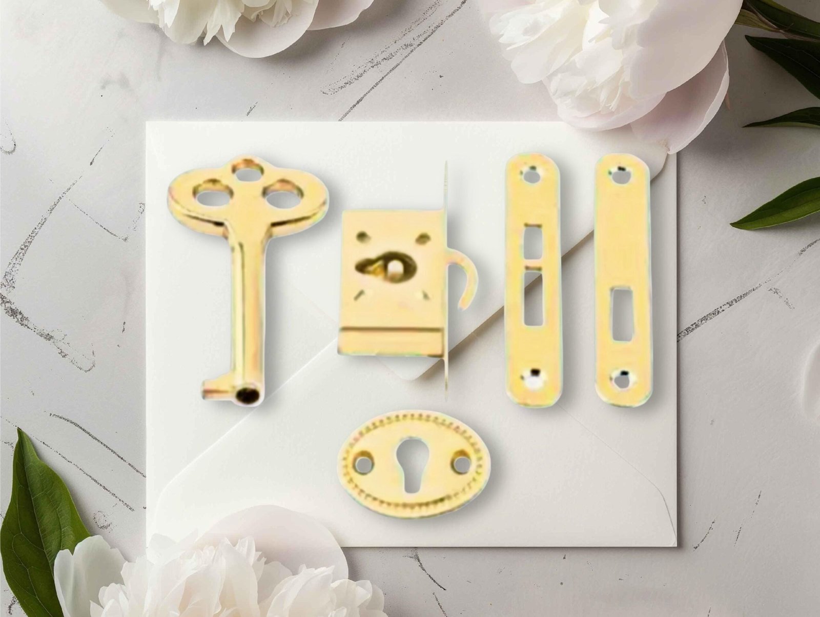 Vintage gold door lock set, brass lock, 5 piece set, antique style cabinet lock, escutcheon, key and lock set