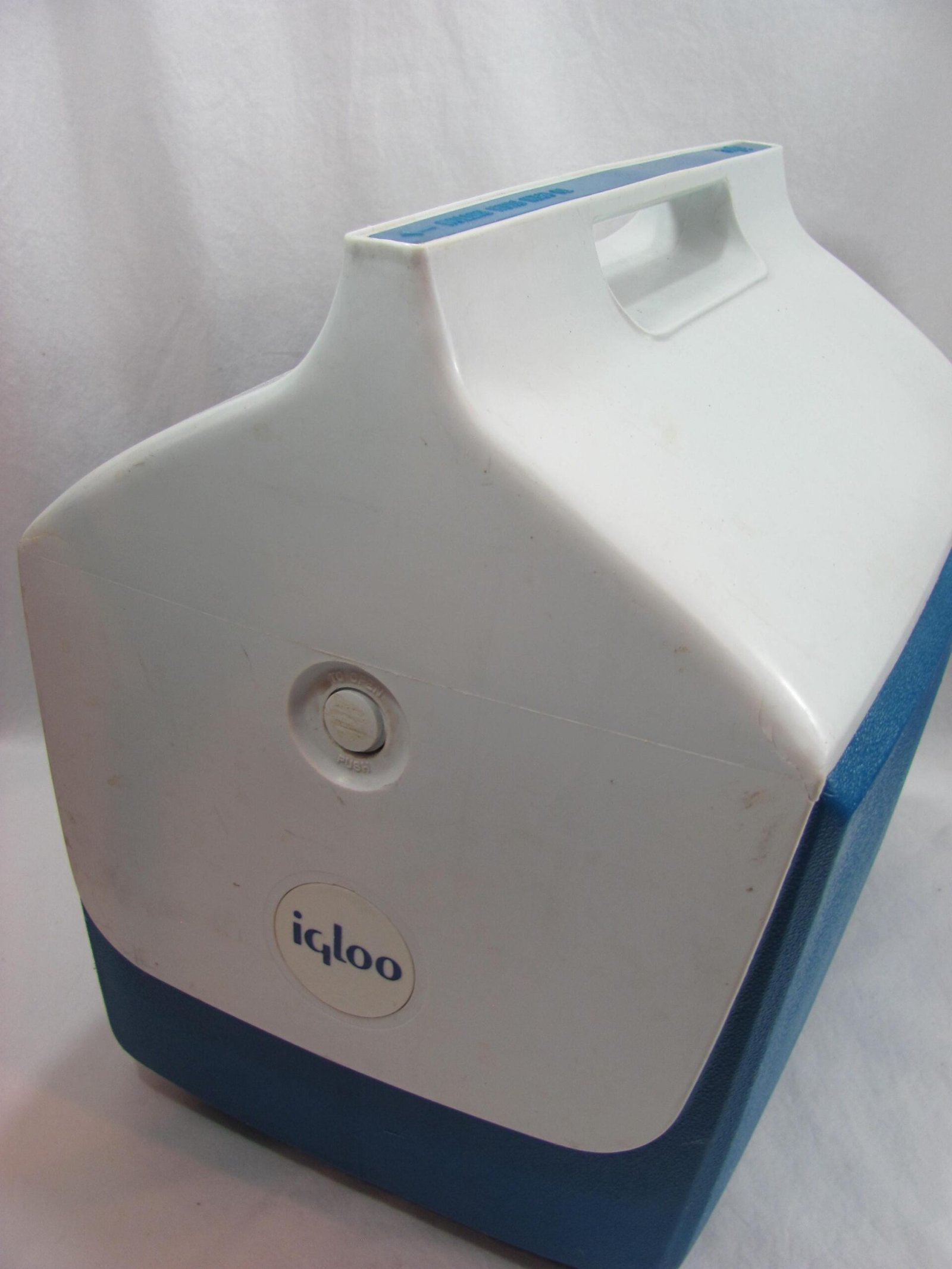 Vintage 15 quart Igloo Playmate cooler – blue & white with side push button