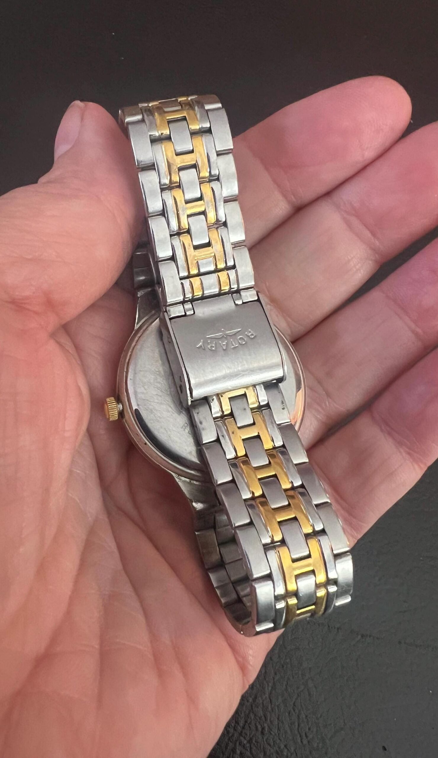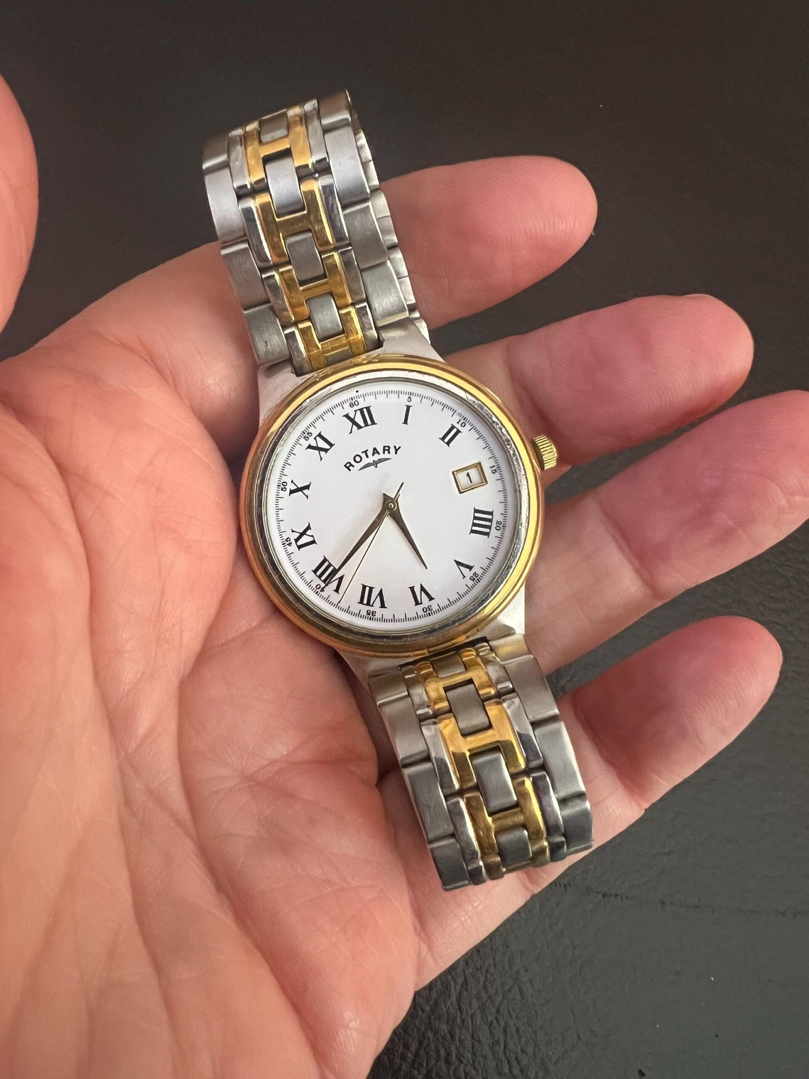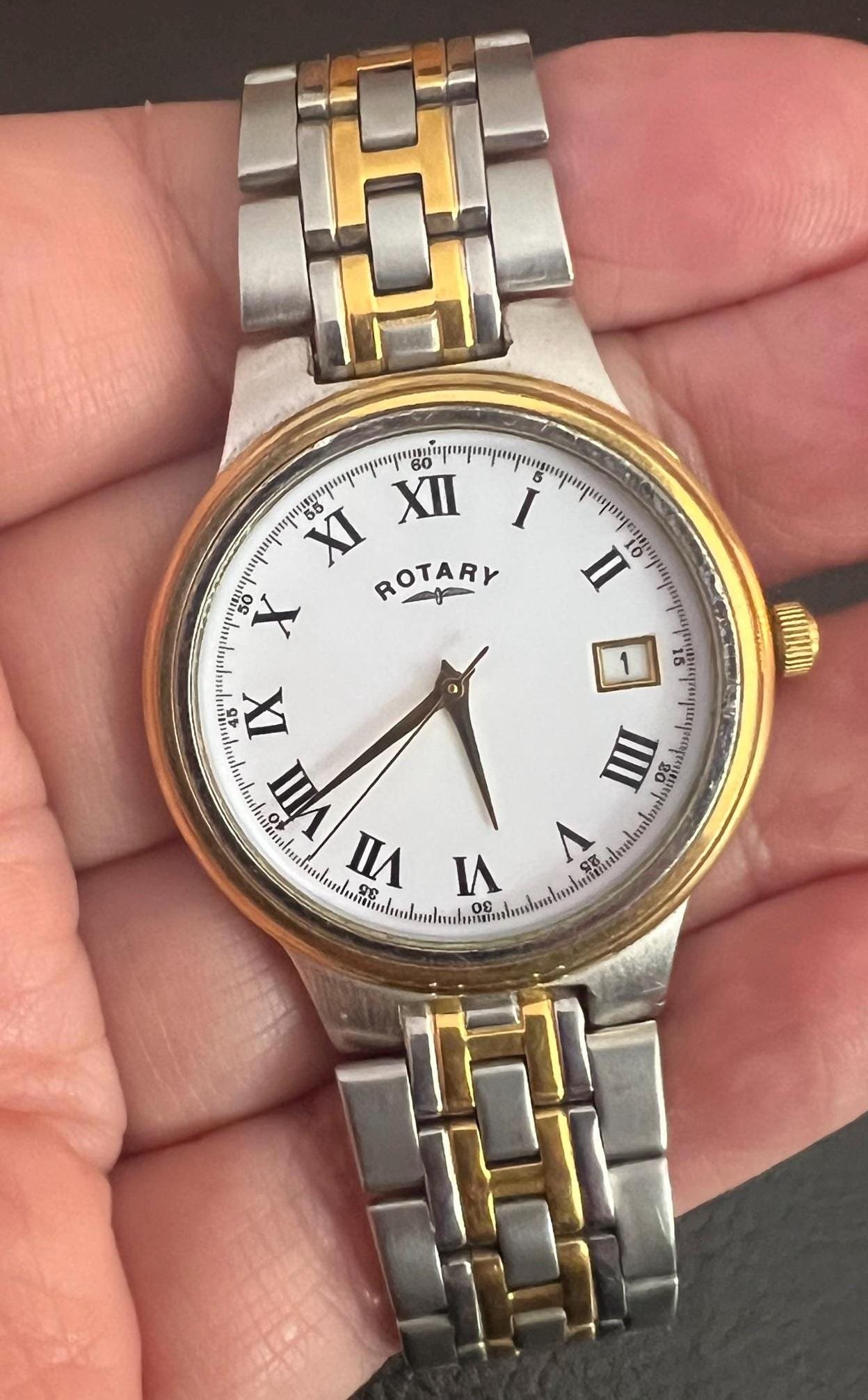 Vintage Rotary watch set in Silver and Gold Tone with a white enamel watch face and a date indicator in good working order