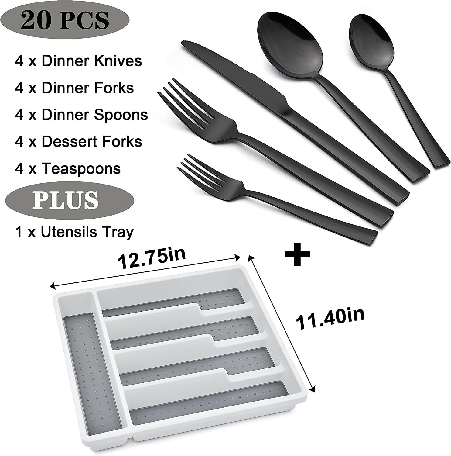 Walchoice 20-Piece Black Silverware Set with Tray, Stainless Steel Flatware Cutlery Set for Home Restaurant, Elegant Eating Utensils Tableware Plus Plastic Drawer Organizer