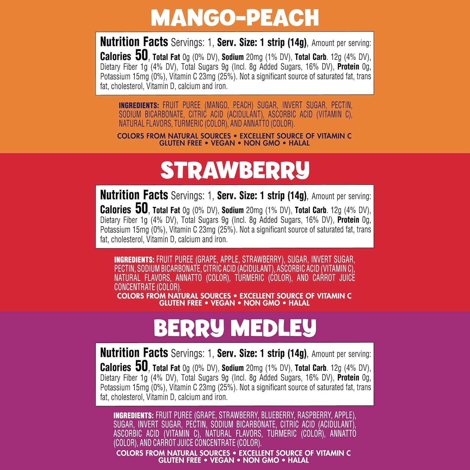 - 50 CT SNACK BOX – Contains 0.5 Ounce strips of Welch’s Absolute Fruitfuls, Berry Medley,Mango Peach, Strawberry flavored Fruit Leather