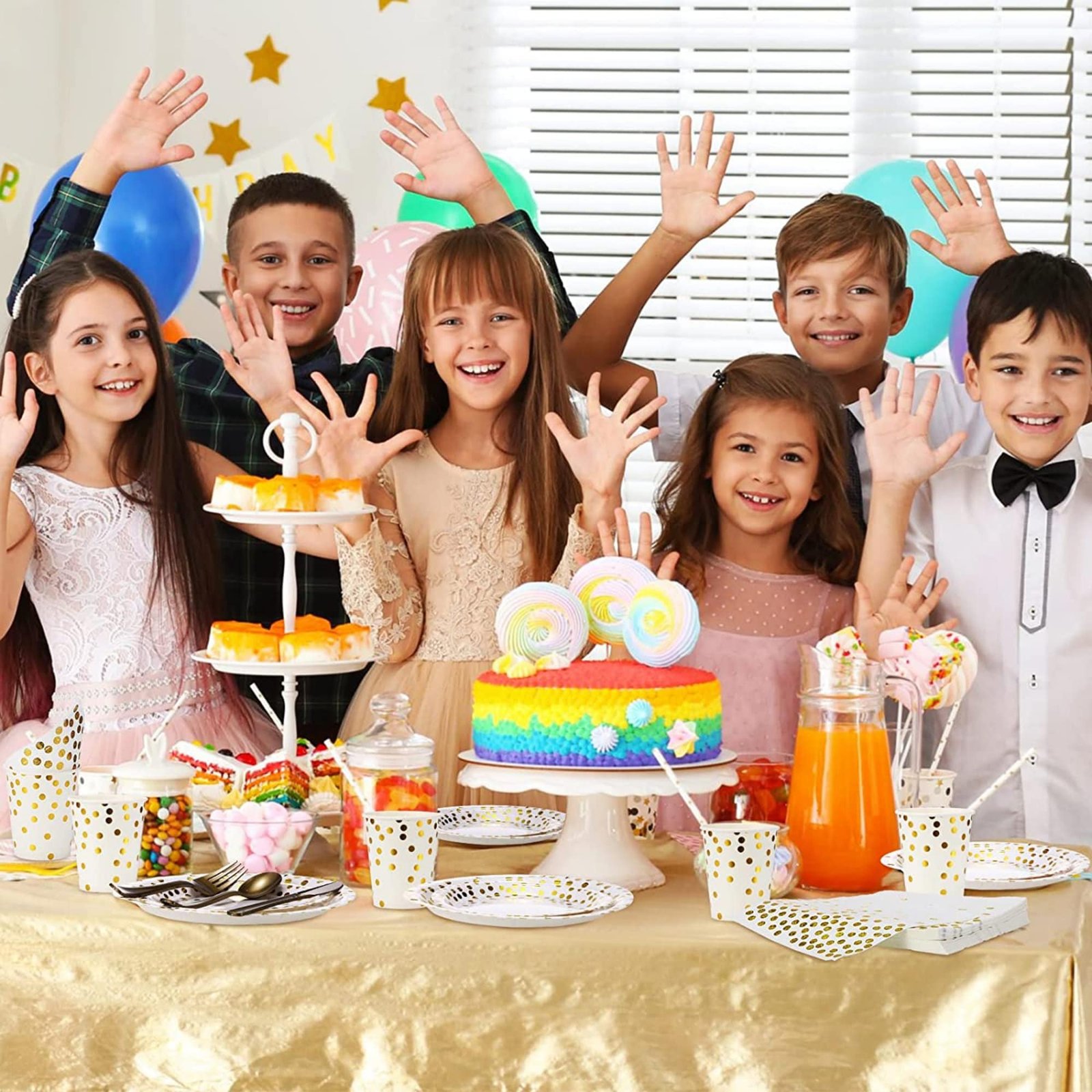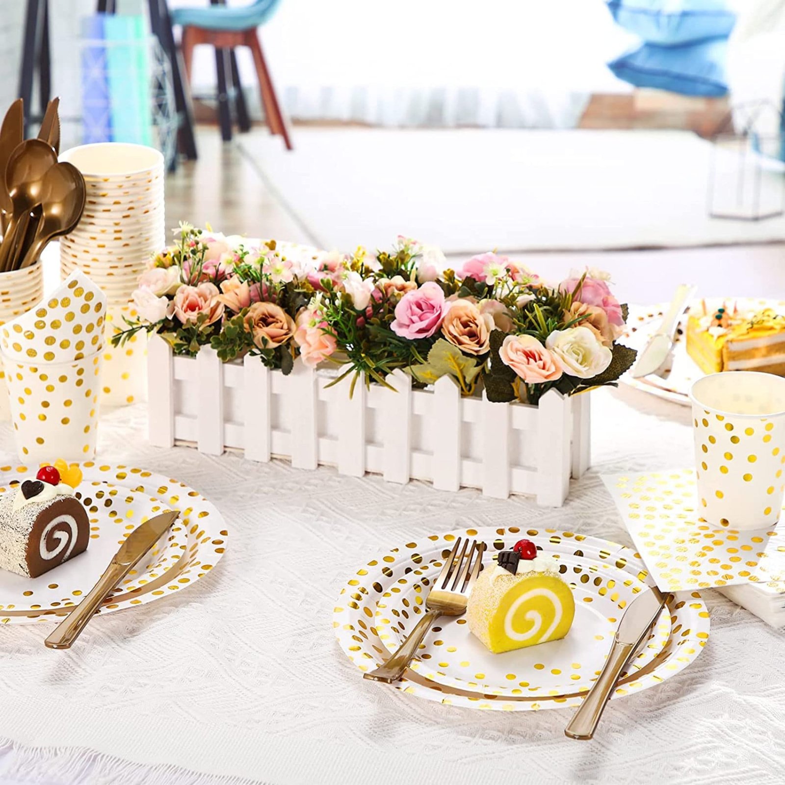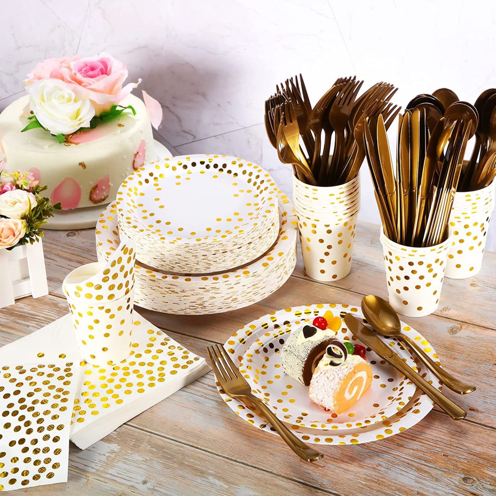 🍕 WHITE AND GOLD PARTY SUPPLIES: These attractive golden foil dot on WHITE paper dinner plates, dessert plates, cups, napkins sure to be loved by everyone. Gold plastic forks knives spoons adding an elegant, modern touch to any party. Perfect choice for a Boy and Girl Sweet 18 Happy Birthday themed party.