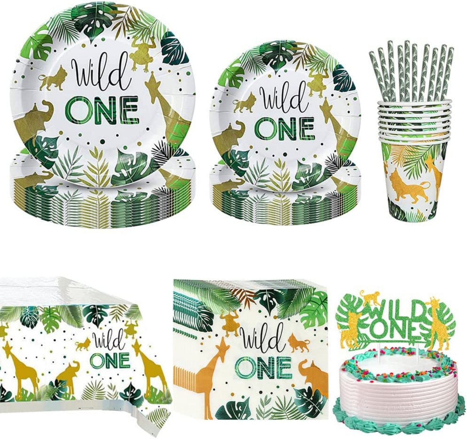 Wild One Party Tableware Disposable Dinnerware Decorations Jungle Safari Plates Cups Straws Tablecloth Napkins Cake Topper Birthday Supplies