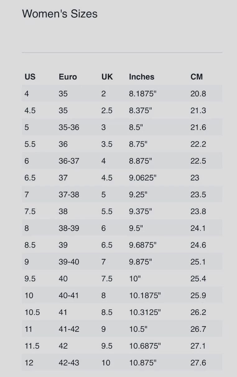 3 US women's ,3.5 US women's ,4 US women's ,4.5 US women's ,5 US women's ,5.5 US women's ,6 US women's ,6.5 US women's ,7 US women's ,7.5 US women's ,8 US women's ,8.5 US women's ,9 US women's ,9.5 US women's ,10 US women's ,10.5 US women's ,11 US women's ,11.5 US women's ,12 US women's |