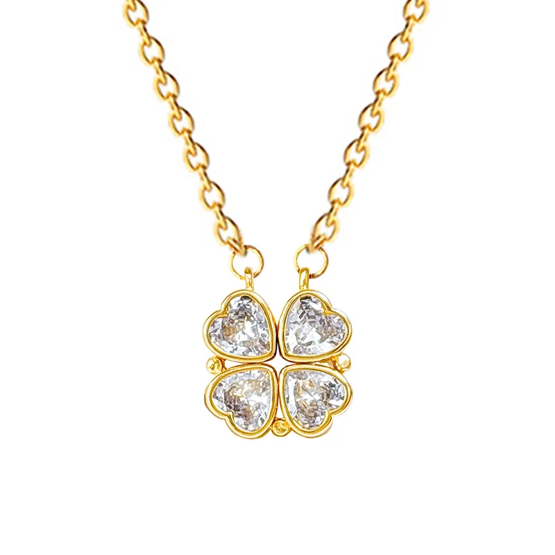 Women’s Heart-Shaped Necklace with High-End Zircon Four-Leaf Flower Pendant Versatile Stainless Steel Collarbone Jewelry