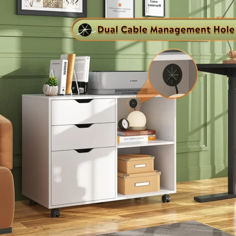 3-Drawer Wood File Cabinet, Mobile Lateral Filing Cabinet, Printer Stand with Open Storage Shelves for Home Office, White